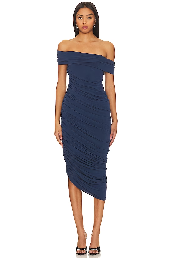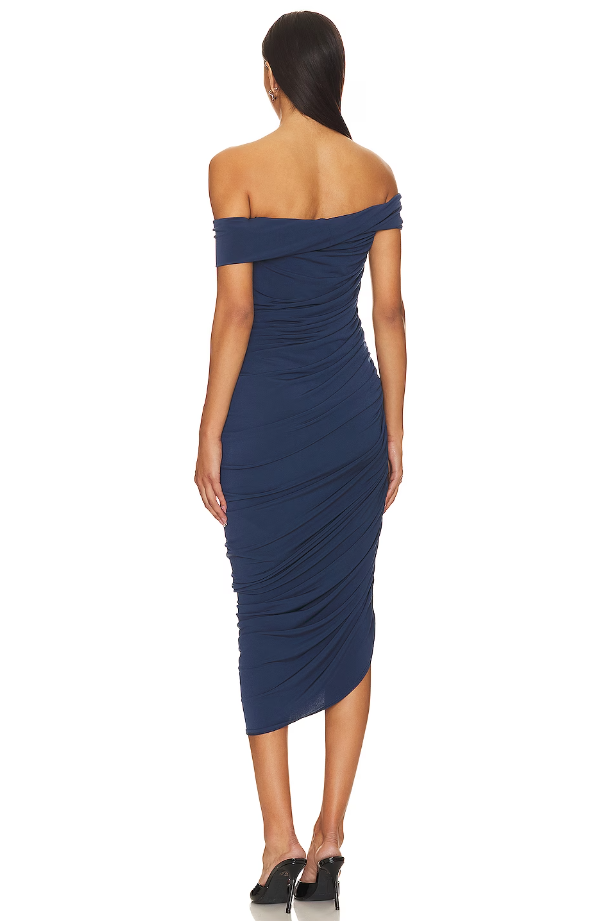 Discover the allure of the Katie May Alana Dress in Deep Sea - a sultry navy midi featuring off-the-shoulder elegance, ruched detailing, and body-hugging allure. Embrace the essence of romantic sophistication.