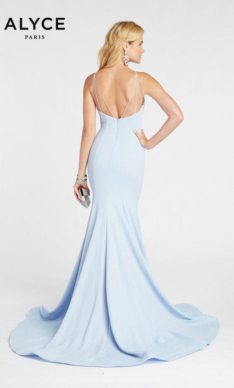 Fitted bodice with a plunging halter neckline with sheer inset detail at the bust complemented with a mid-open back.