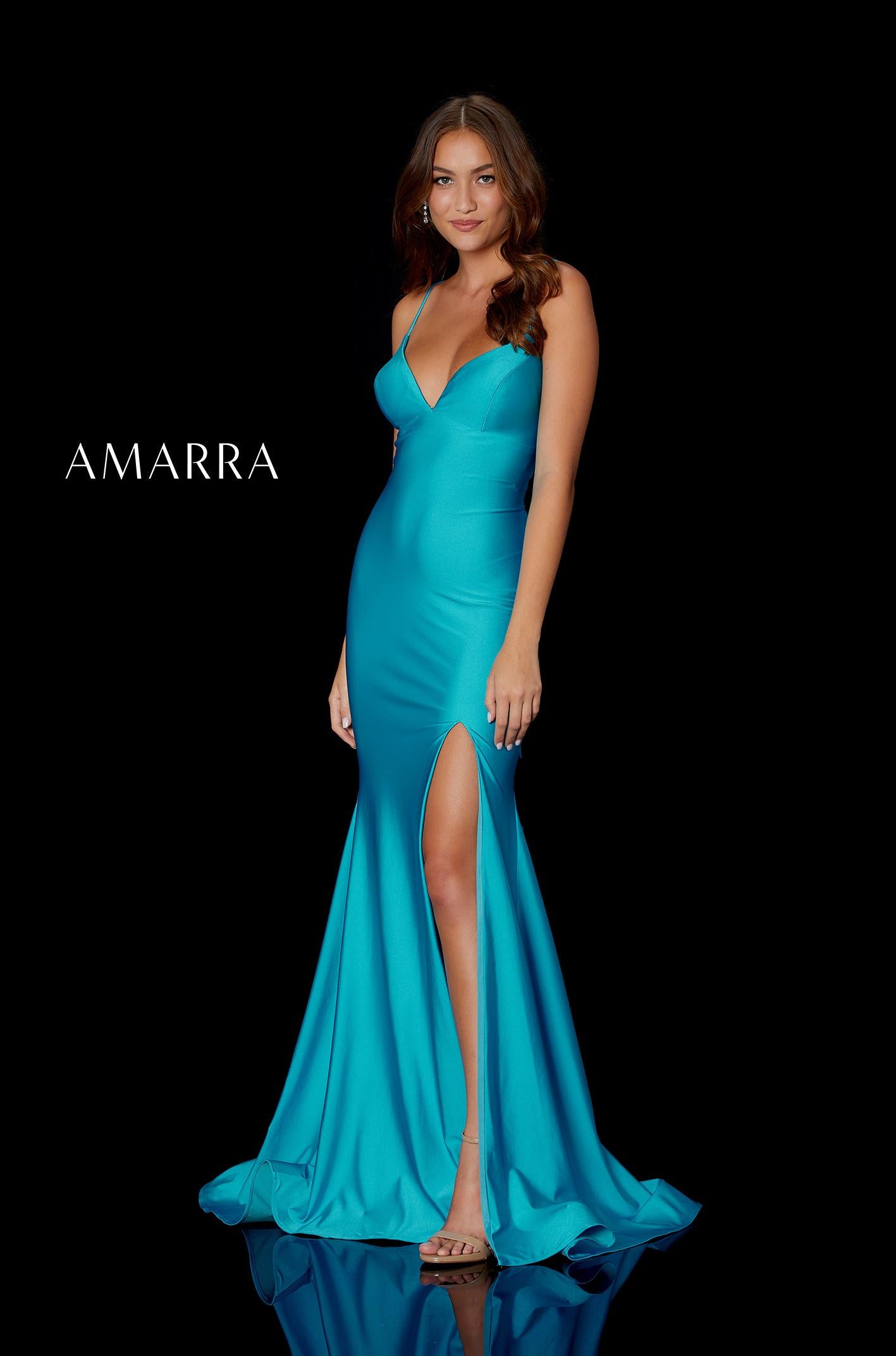 A gown with a flirty flare and perfect for any event. Less is more with AMARRA 87255 stretch jersey fitted gown. The material is made to hug your curves and pull you in at all the right places. This gorgeous style features a sweetheart neckline and a high slit, turning this fitted daydream into a flirty affair. To complete the look, the back features a wide loop strappy back and a flared hemline, adding extra volume to your silhouette. This style was made for the girls looking for a form-fitting dress that delicately hangs on their curves and gives them a flirty figure.