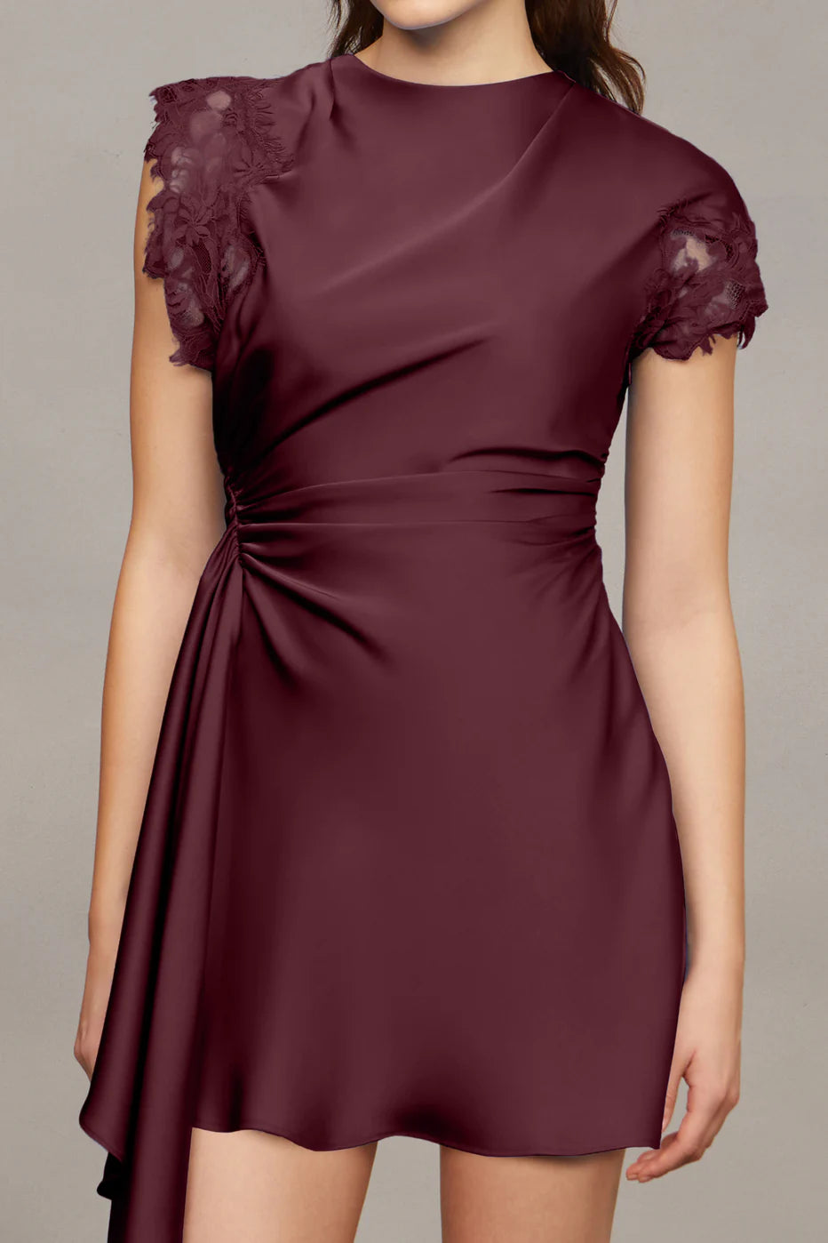This silky mini keeps the drama with asymmetric lace-trimmed sleeves and a side-draped sash. The ruched waist sculpts just right, while the A-line hem adds a flirtier finish. Equal parts sultry and sweet.