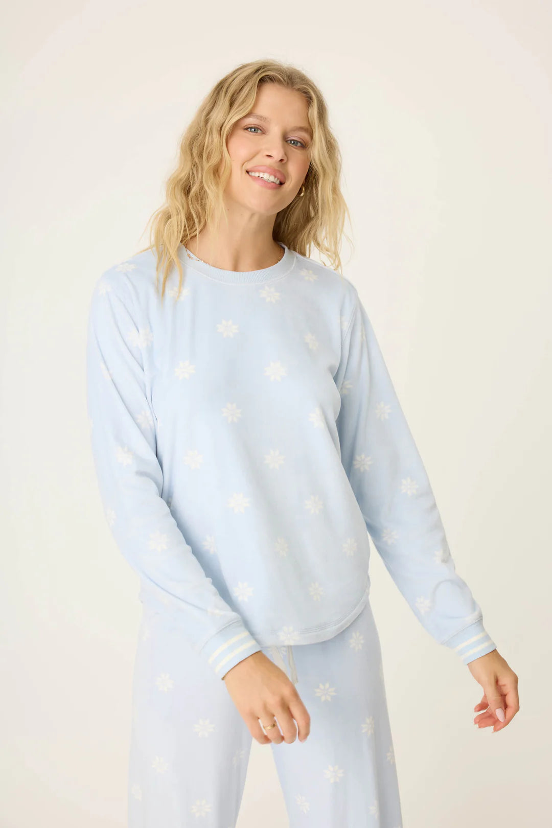 Chill out in a long sleeve PJ top featuring a delicate white snowflake pattern. Crafted from soft, cozy velour fabric, this top offers a comfortable fit for restful nights and leisurely mornings. The gentle pale blue color creates a chill winter vibe, perfect for winter lounging. Pair it with your favorite pajama bottoms to create a charming winter ensemble that keeps you warm and stylish during the chilly season.