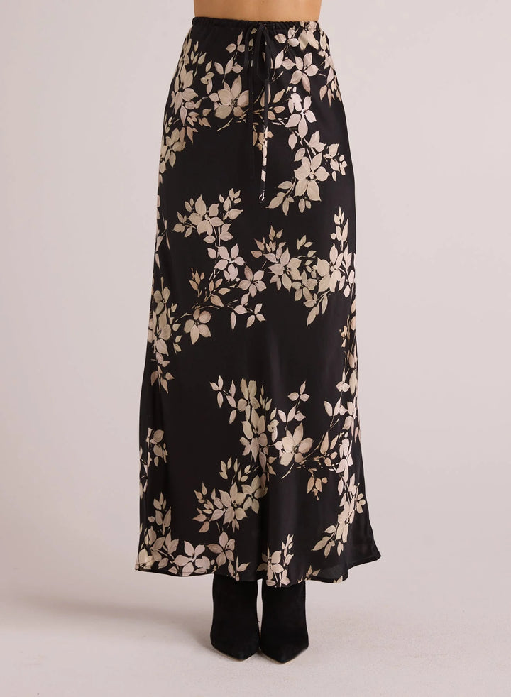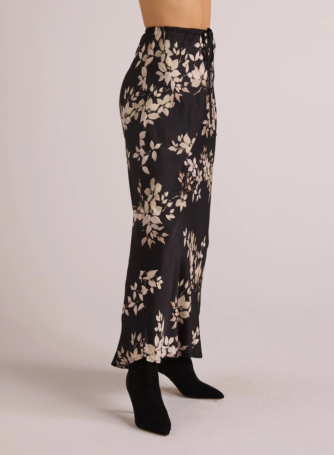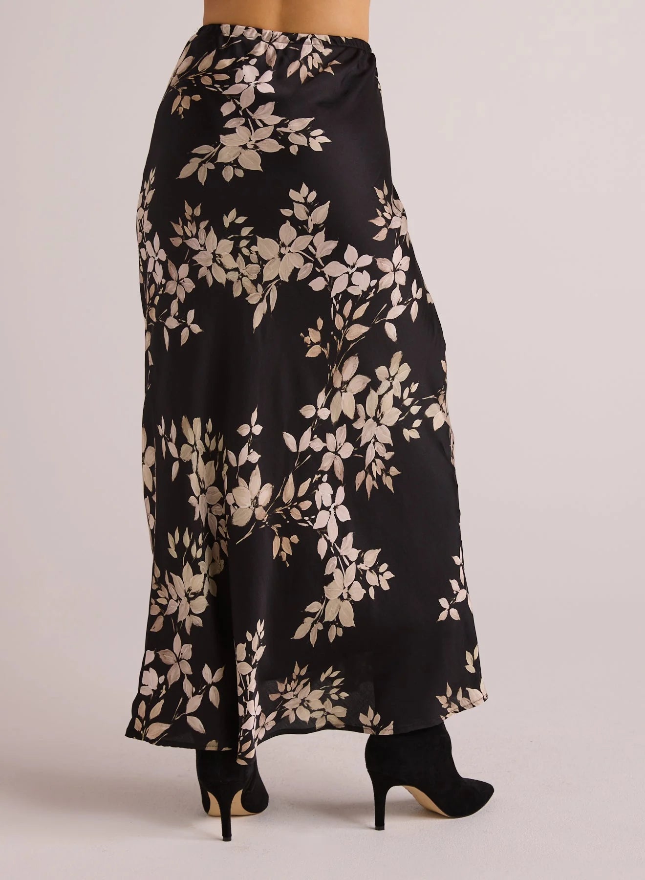 This elegant maxi skirt features a beautiful ivory floral print, adding a touch of femininity to any outfit. Its flowy bias cut provides a flattering silhouette. Perfect for a polished and sophisticated look.