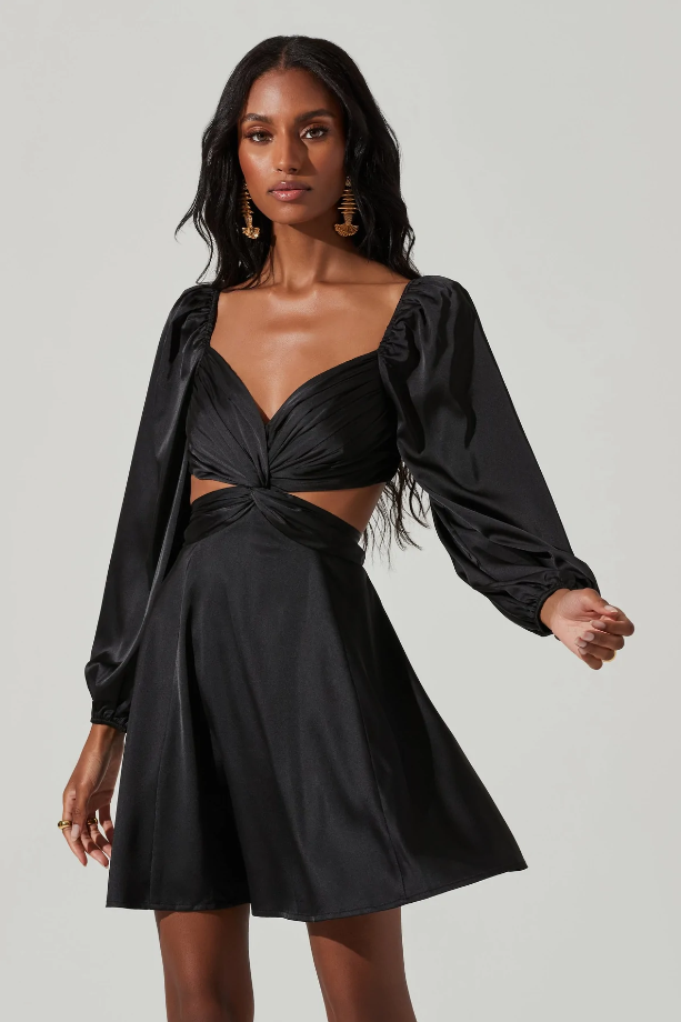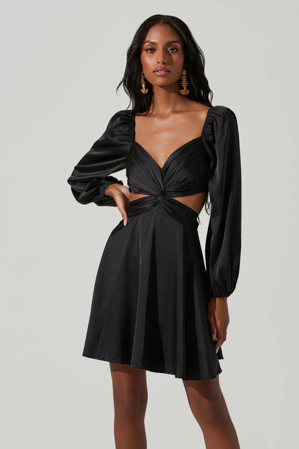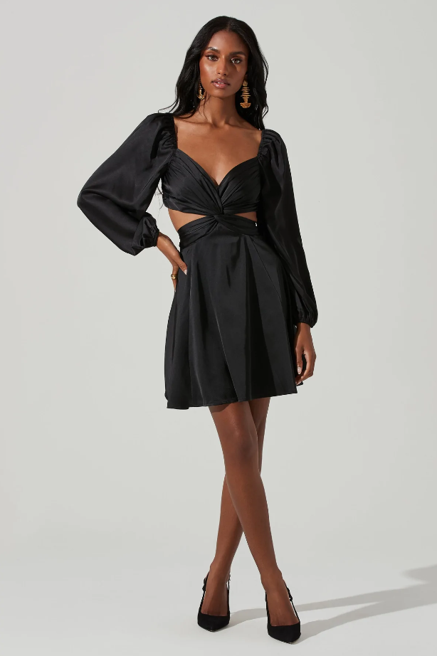 A sweet silhouette, the Anamaria Dress is just the occasion look refresh you need. Sweetheart neckline features a twist front bust and leads to side cutout accents. Flowy circle mini skirt. Long puff sleeves with elastic cuffs. Smocked back with cutout detail. Concealed back zip closure. Lined.