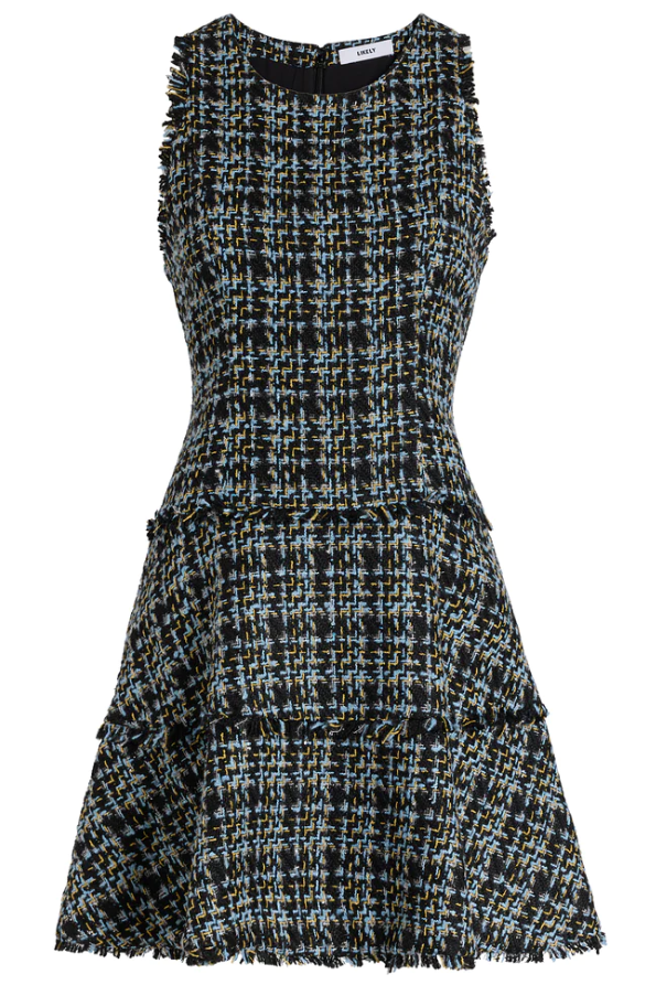 Give a unique and on-trend look with the Likely Tweed Jewel Dress. Featuring tiered skirt, fringed hemlines and sleeveless style. Perfect for the cooler weather!