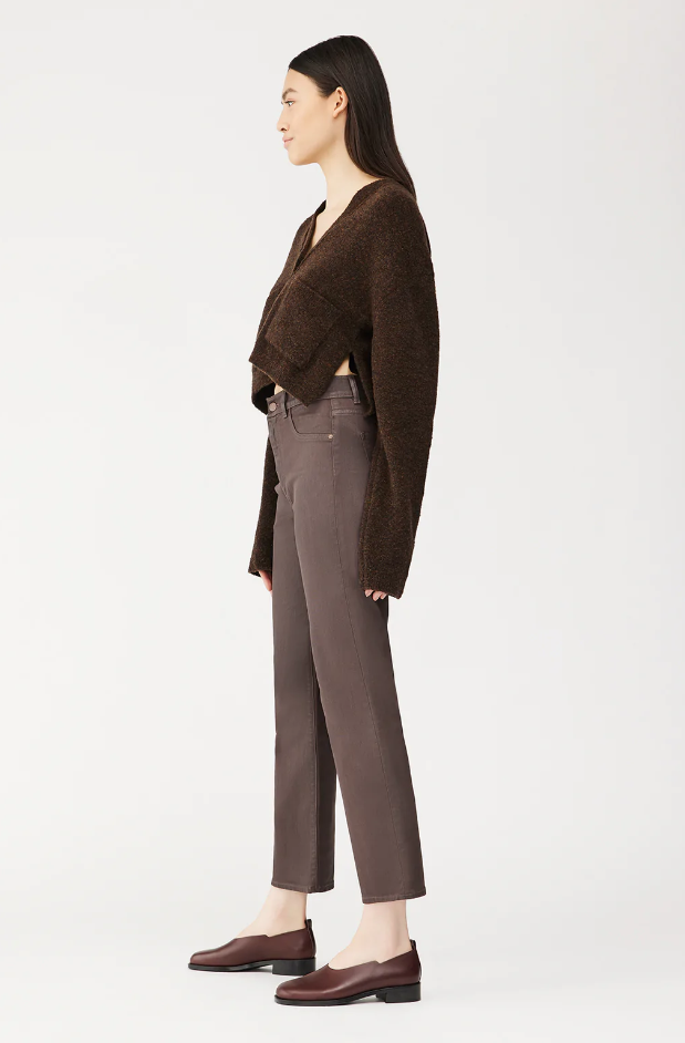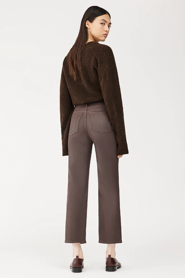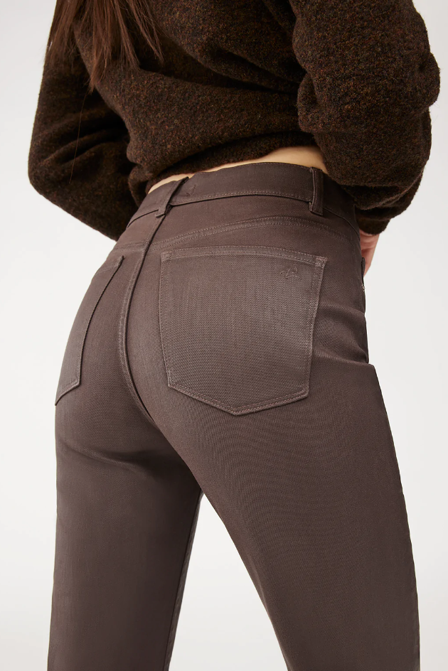 Black Coffee is a wax coated deep brown that combines the comfort of soft, stretch denim with a leather-like look. It features antique copper hardware, faux pockets, tonal stitching and a clean hem.