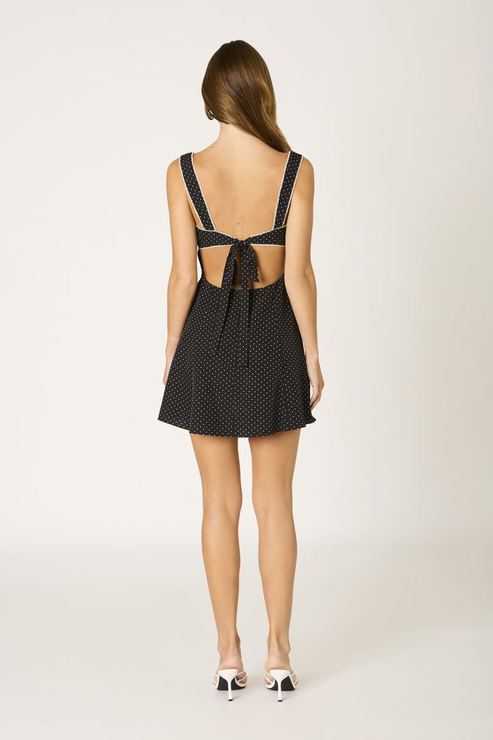 A-line mini dress in dotted crepe with pleated bust, wide straps, and a back tie detail.