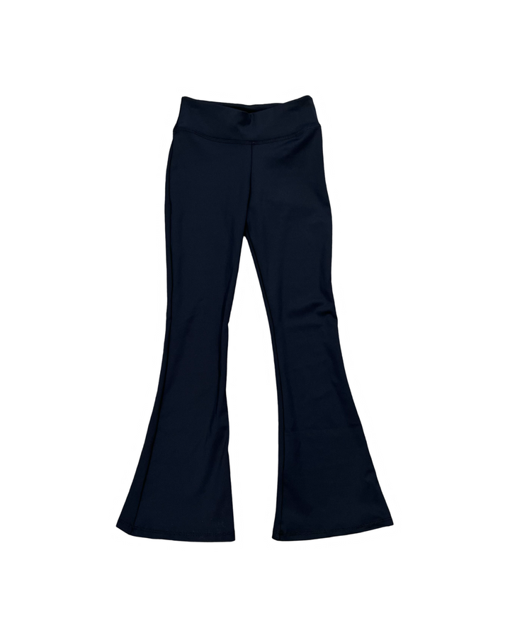 Dori Creations black flare leggings in their spandex/lycra fabric. Stretchy with a little sheen to it.