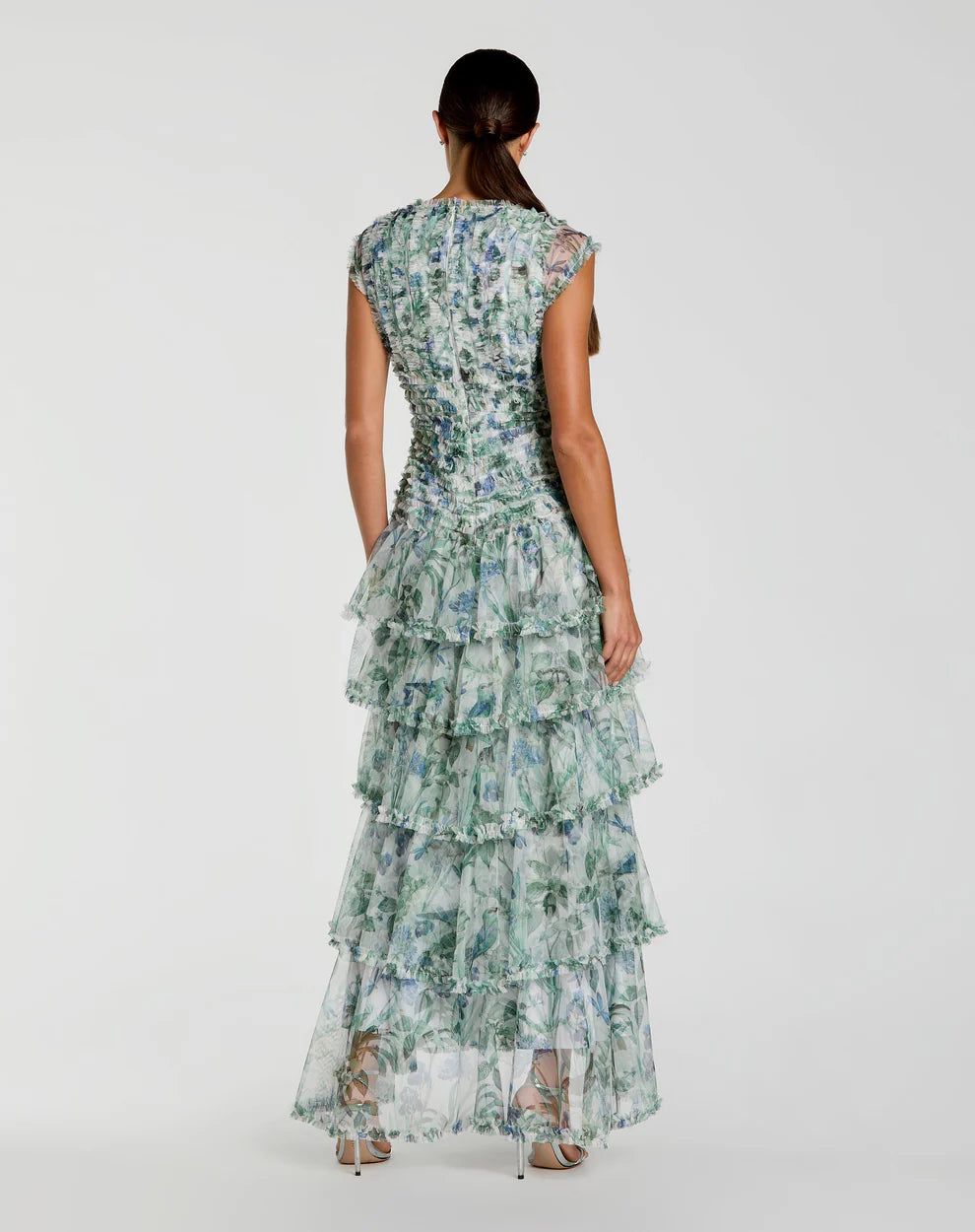 Turn heads at spring events in this stunning Mac Duggal maxi dress! The lightweight mesh fabric drapes beautifully while the tiered ruffles add movement and dimension. A vibrant floral print brings the garden to life, while the flattering V-neckline and flowing silhouette work magic on every figure. Perfect for weddings, garden parties, or any occasion calling for effortless elegance with a playful twist.