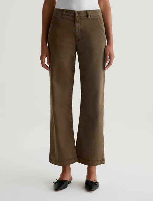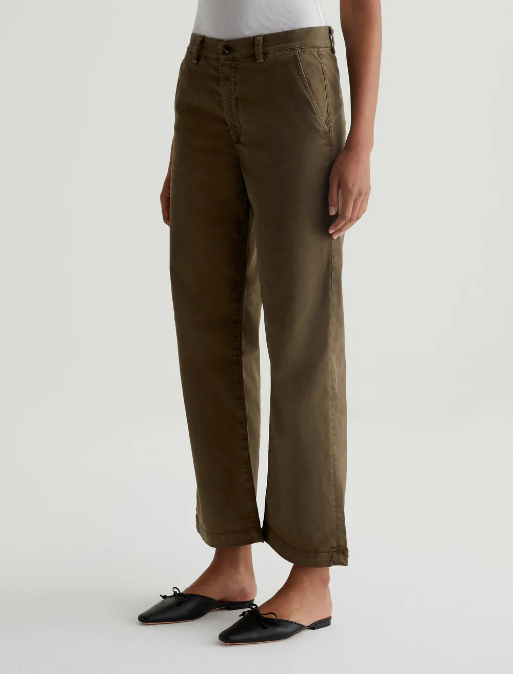 AG Jeans best-selling Caden trouser, updated in an easygoing straight-leg silhouette. Cut for a relaxed fit at the hips, these women's tailored pants are made from 7.9 oz. Sorrento Stretch Twill in a sulfur-dyed shade of light brown (has an olive undertone). Slant front pockets and welt pockets at the back finish the look.