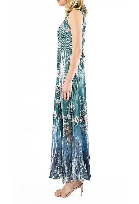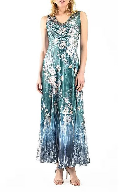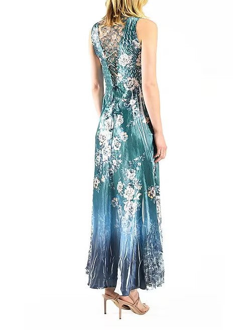 Komarov Calypso Border Floral Lace Charmeuse V-Neck Sleeveless Pyramid Accordion Pleated A-Line Dress