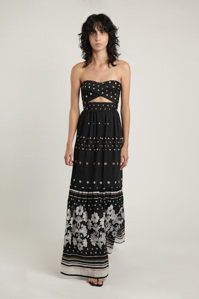 Sabina Musayev black floral bandana print strapless maxi dress with a twisted front detail, cutout, and back lacing with detachable straps.