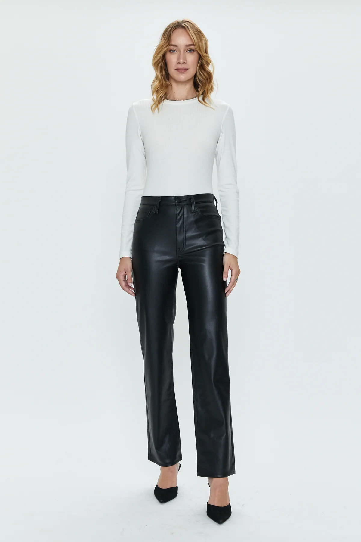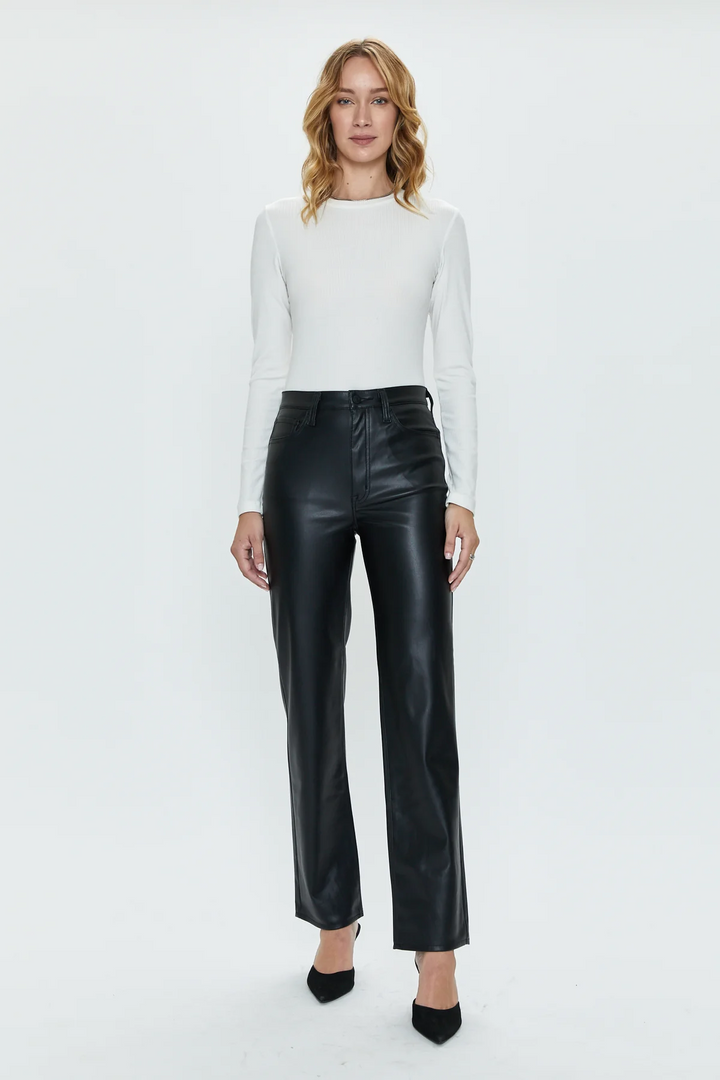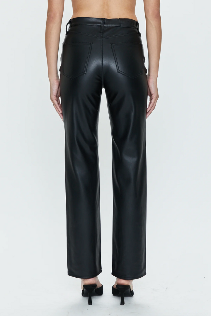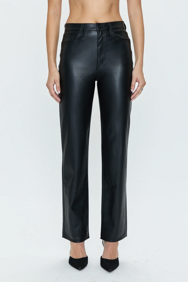 A classic straight leg in soft and vegan alt leather. With pockets and a zipper front for a cleaner look, this buttery style is made to take you from day to night. This super high rise version of the Cassie embraces your figure by pinching your waist and making your legs look longer