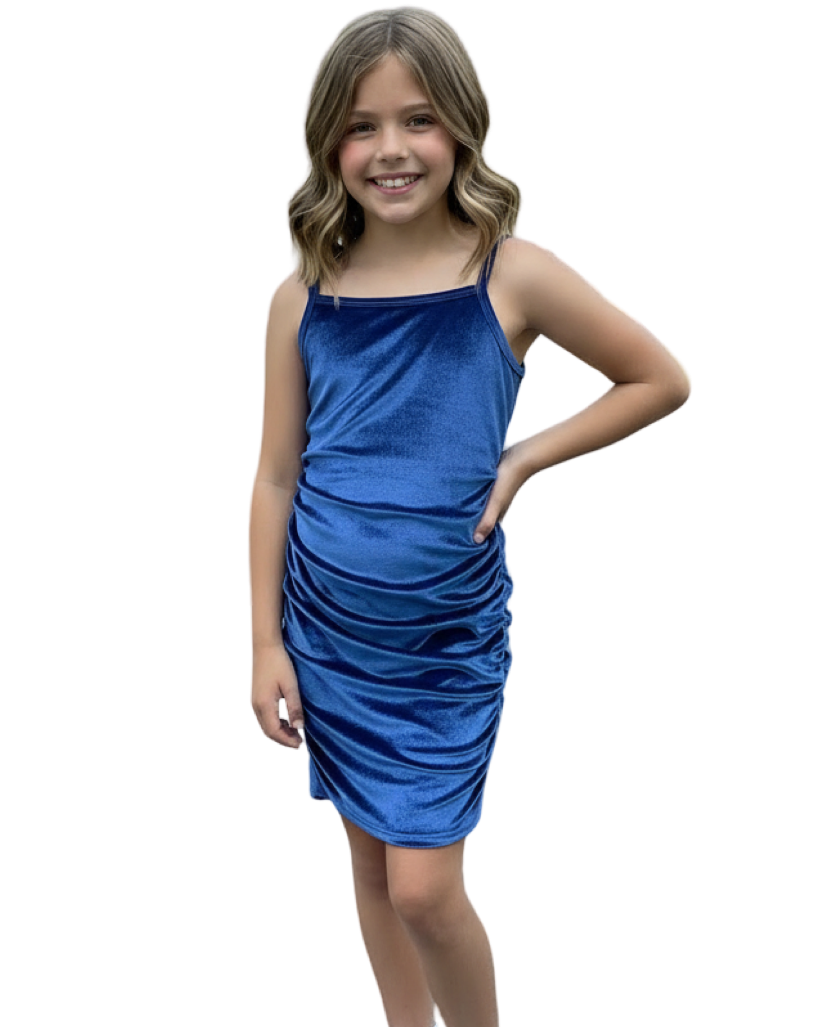 Cheryl Creations has done it again! Take a good look at their new blue velvet ruched cami Brenda Dress. Featuring a luxuriously soft and well-structured velvet fabric in a dazzling blue shade, your girl will be ready to take on her next event in style!