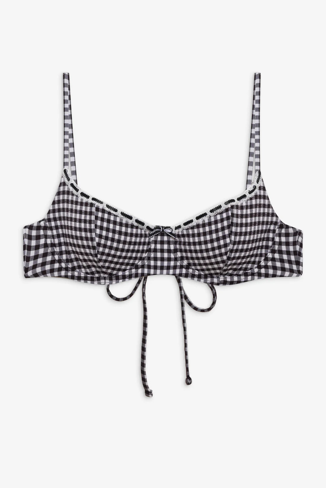 This Frankies bikinis bralette bikini top will give you the lift you're looking for. The Cola bikini top features specialty lace detailing, textured fabric, and a new Blackberry Gingham pattern.