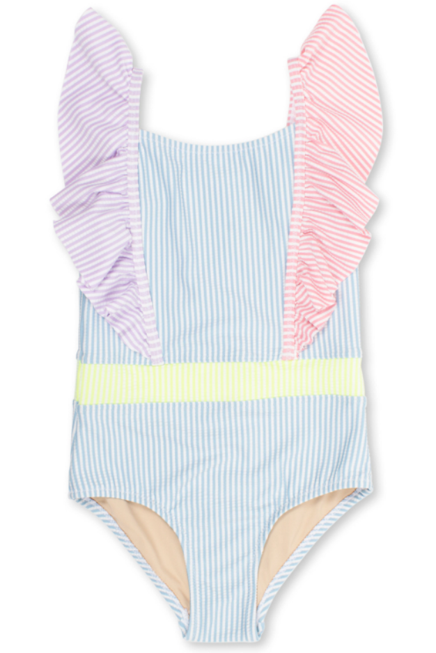 Girls Colorblock seersucker ruffle shoulder swimsuit