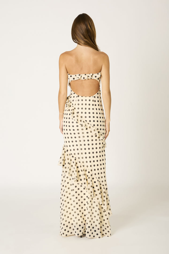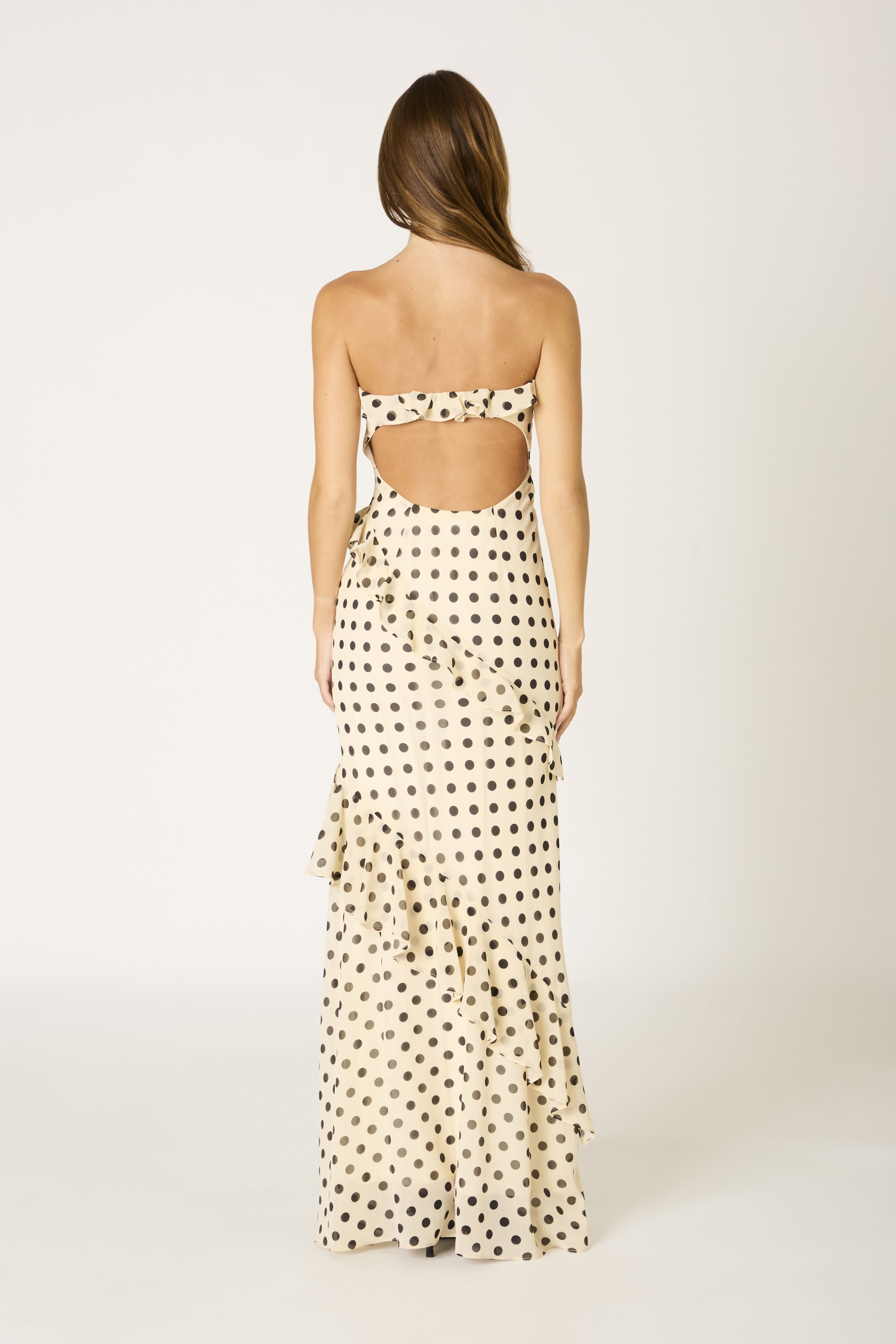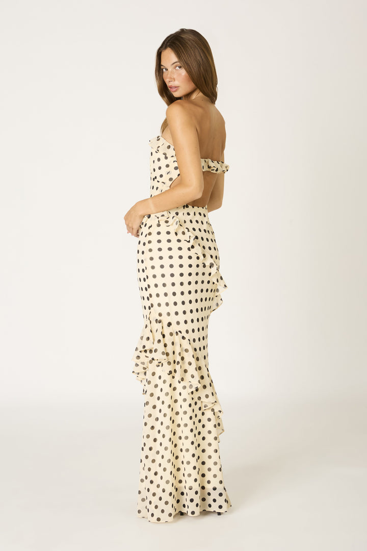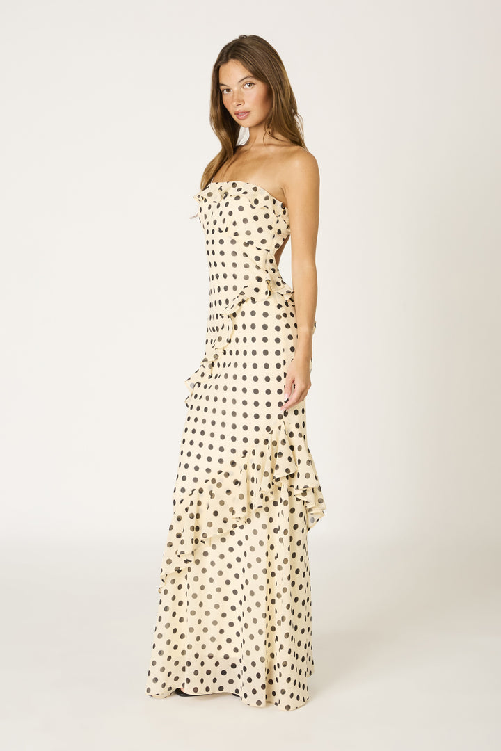 This polka dot strapless maxi dress features a ruffled neckline and cascading asymmetrical ruffle trim with an open back and fitted silhouette.