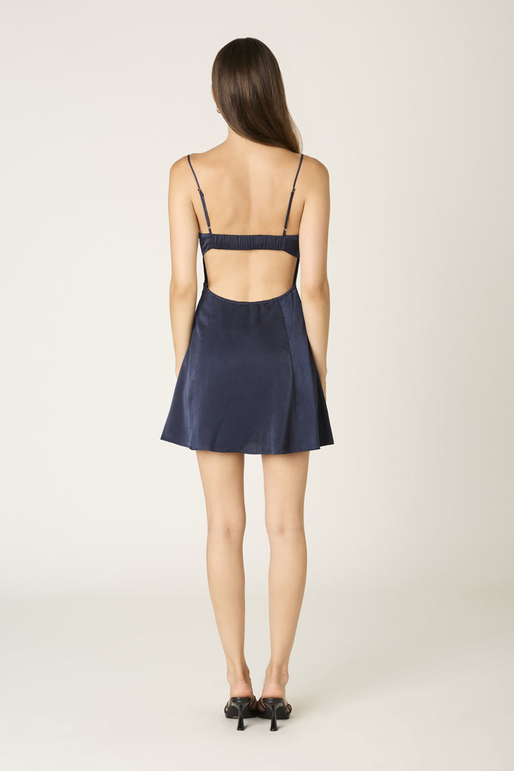 A satin mini dress with a twist bust, sweetheart neckline, and open back.