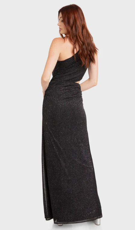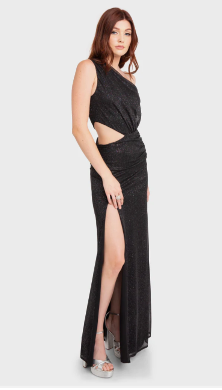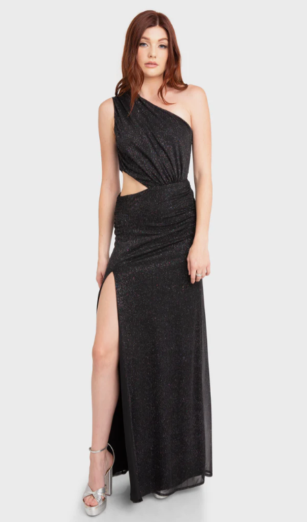 Black Halo black multi sparkle one shoulder size cutout gown with slit.