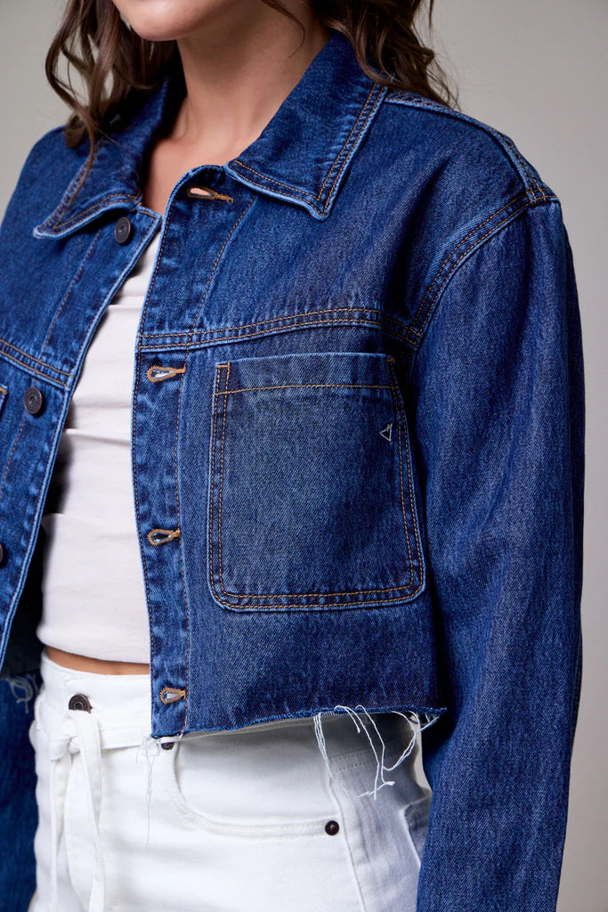 Add a splash of edge to your look with this Dark Wash Cropped Denim Jacket. Featuring a trendy frayed hem, it’s perfect for layering over your favorite tees or dresses. The dark wash gives it a cool, versatile vibe, while the cropped cut adds a playful twist to classic denim. Ready to turn heads and keep you comfy all day? This jacket’s got your back!