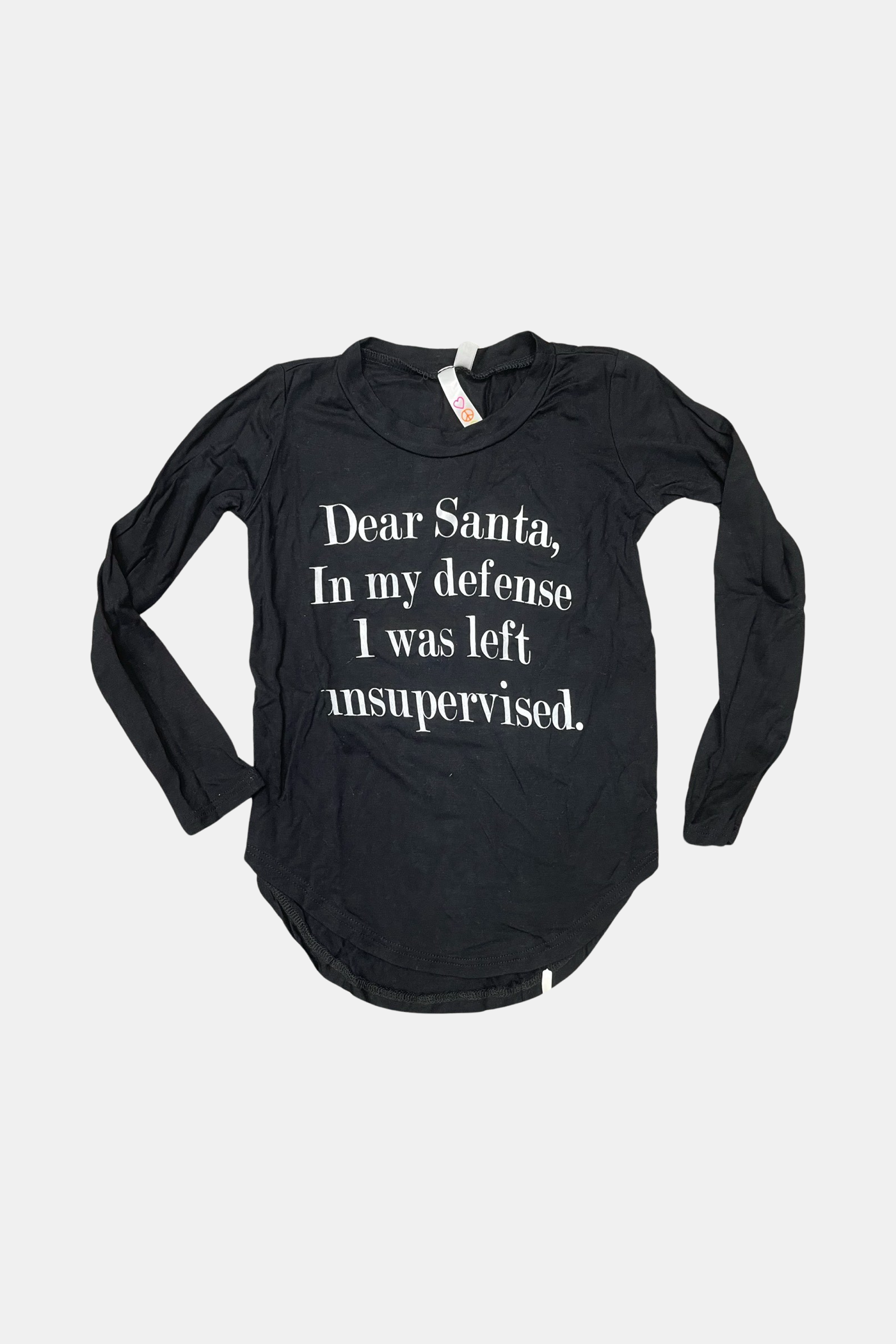Malibu Sugar black long sleeve top with "Dear Santa, In my defense I was left unsupervised" screen.