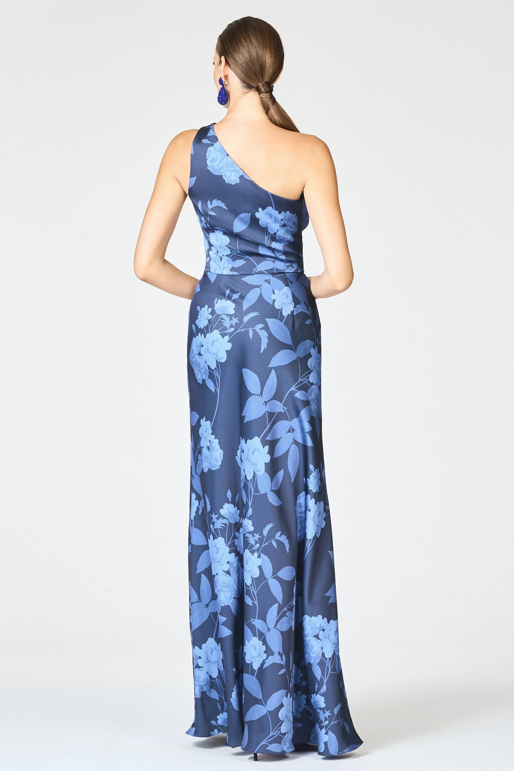 The printed satin crepe cutie, featured in our Wild Steel Roses print, flatters in all the right places. Timeless yet modern, this gown will be on your black tie rotation.