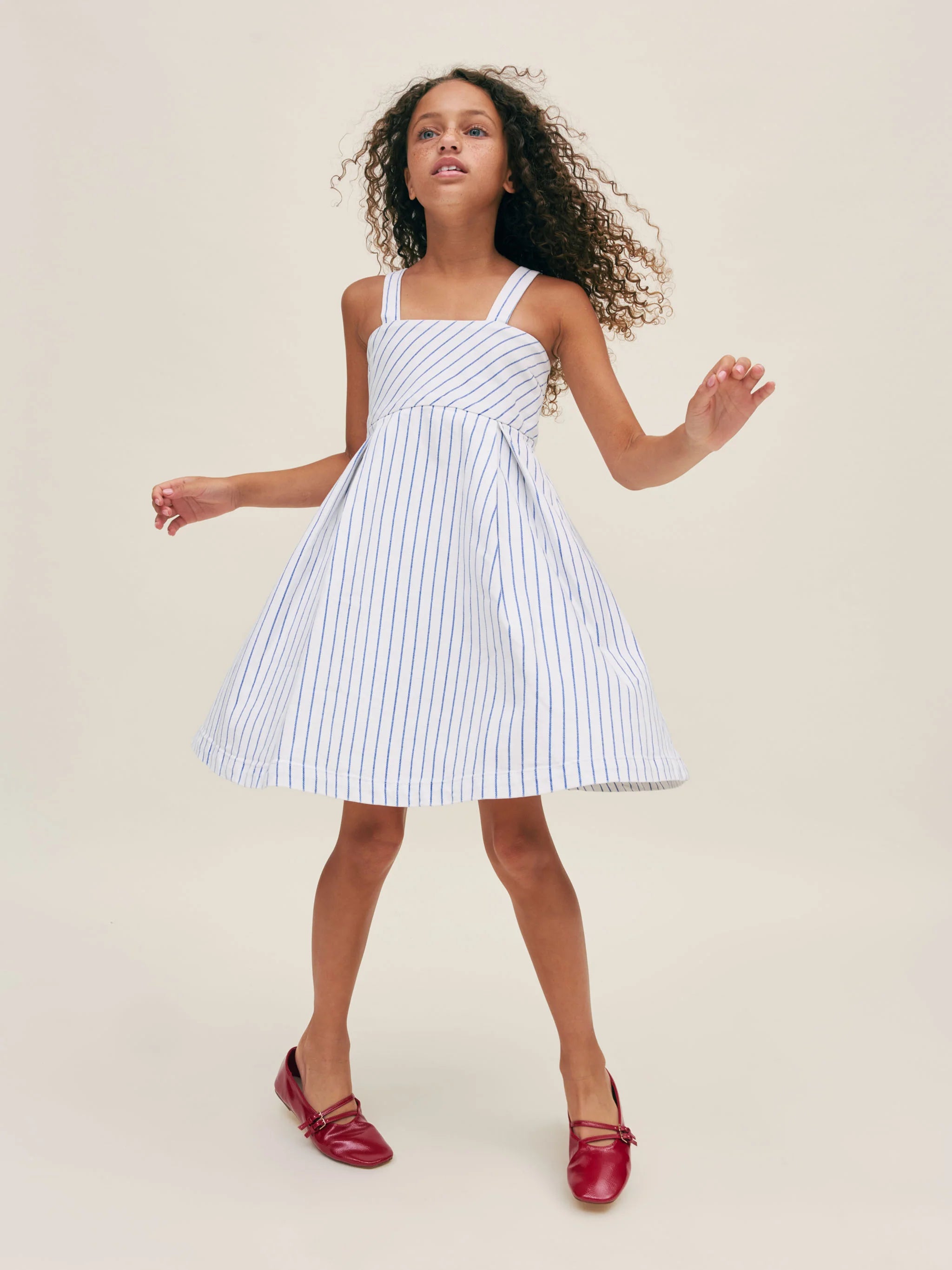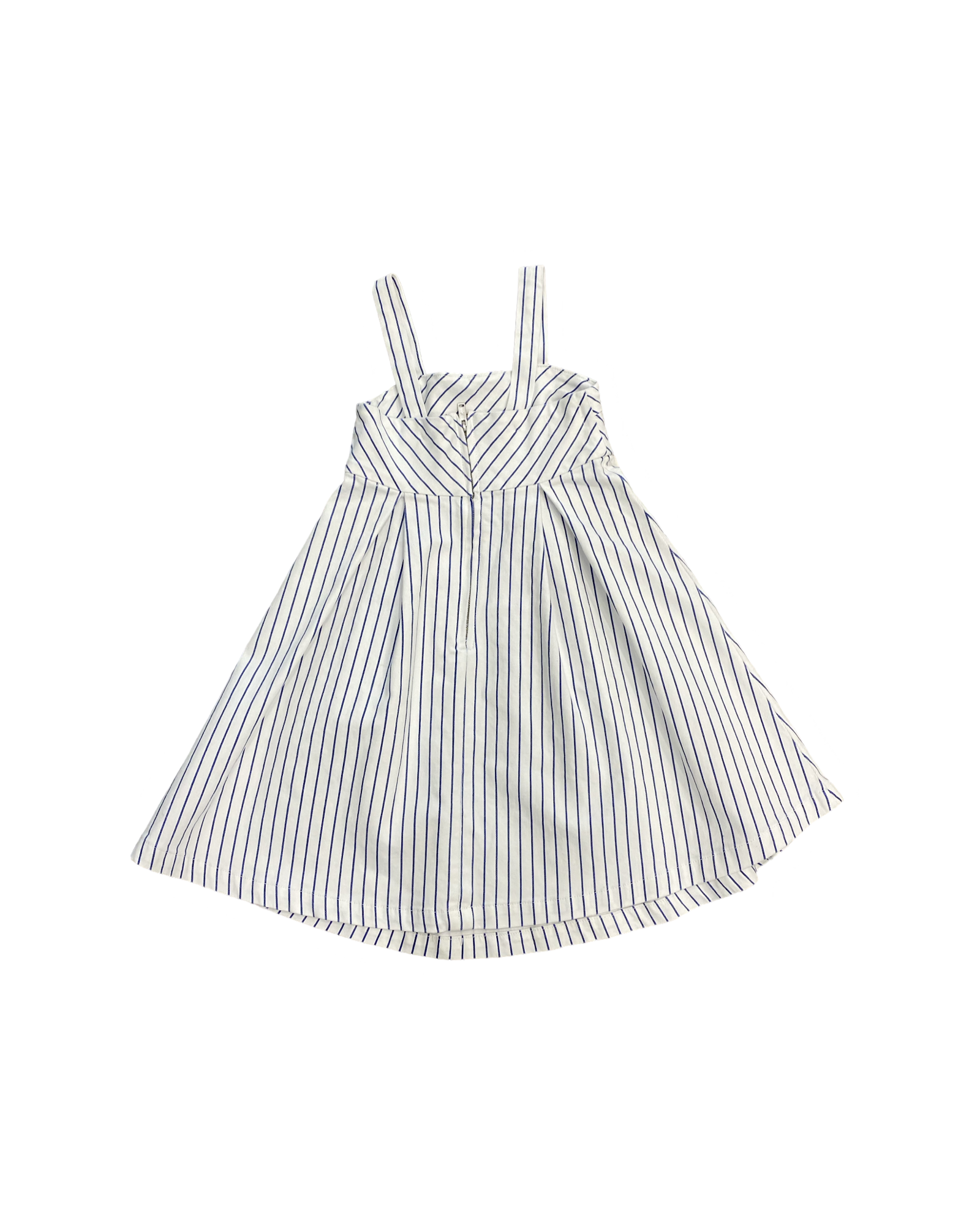 Nautical Stripe is a deep blue stripe pattern on stark white denim. It features a silver zipper, tonal stitching, and a clean hem.