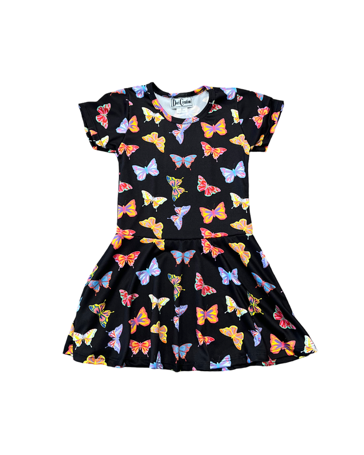This girls' short sleeve butterfly dress combines playful charm with comfortable wear. Its lightweight fabric and skater silhouette make it perfect for active days with a sweet, whimsical touch.
