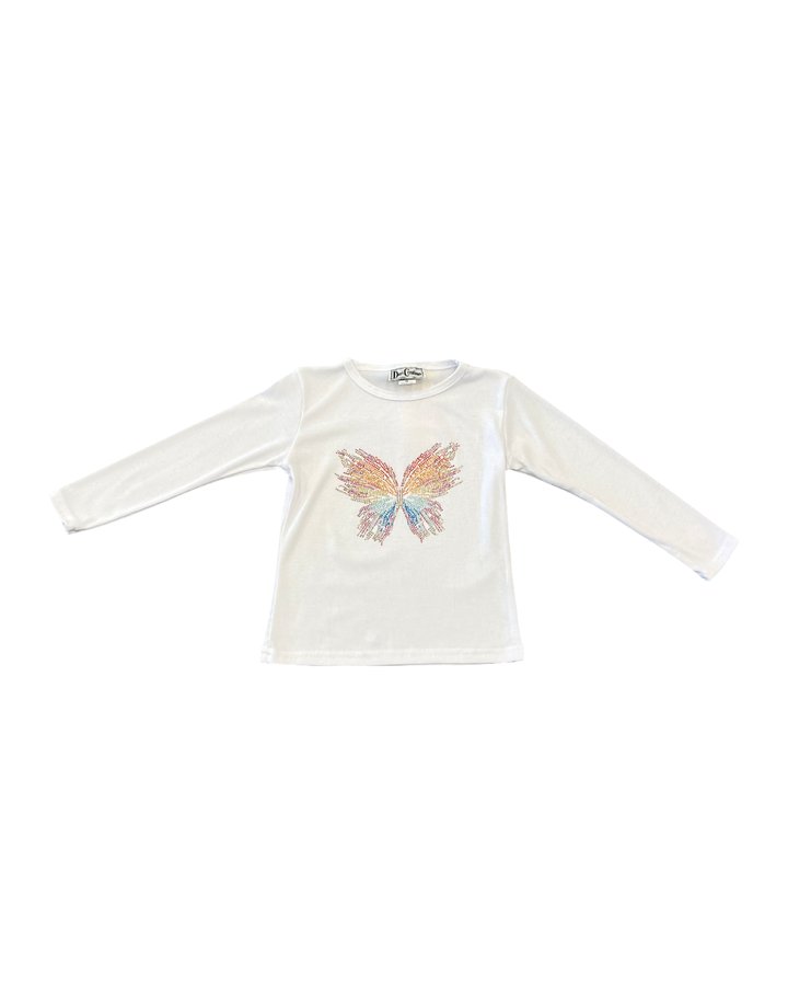 This Girls Studded Butterfly Top by Dori Creations combines a crisp white ribbed fabric with vibrant multi-color studs forming a butterfly for a playful yet stylish look. The long sleeves provide cozy coverage, making it perfect for layering or wearing on its own. Designed for comfort and eye-catching charm, this tee adds a fun, colorful touch to any girl's wardrobe with a standout butterfly detail she’ll love to show off.