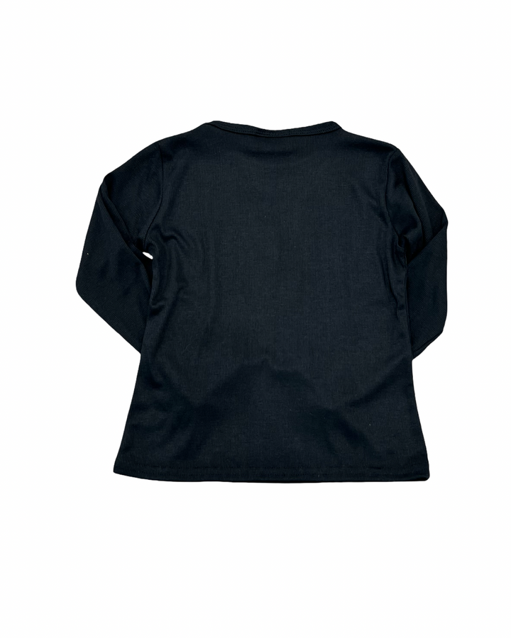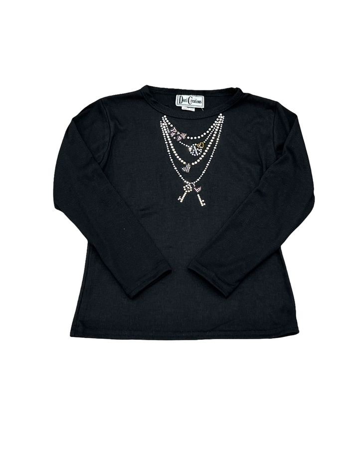 This girls long sleeve top from Dori Creations combines style and comfort effortlessly. Featuring a black ribbed fabric, it is enhanced with a striking studded necklace detail that adds a touch of edgy elegance. Perfect for everyday wear or special occasions, this top offers a fashionable yet cozy fit that your little one will love. Elevate her wardrobe with a piece that stands out with subtle sophistication.