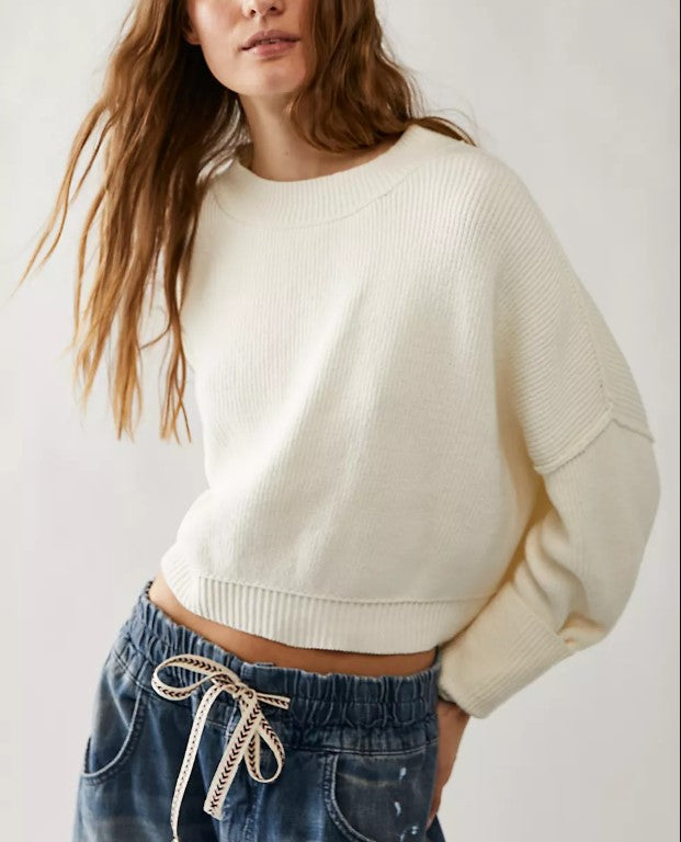 So cool and classic, this forever essential pullover sweater is featured in a slouchy, cropped silhouette and ribbed knit fabrication with mock neckline, defined seaming, and slightly exaggerated sleeves for added shape.