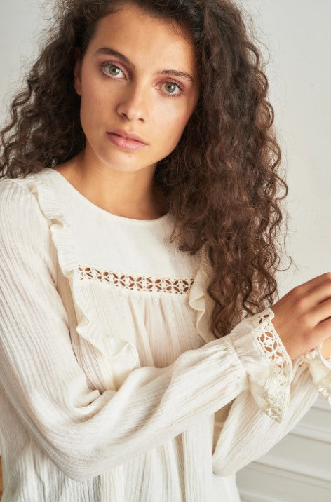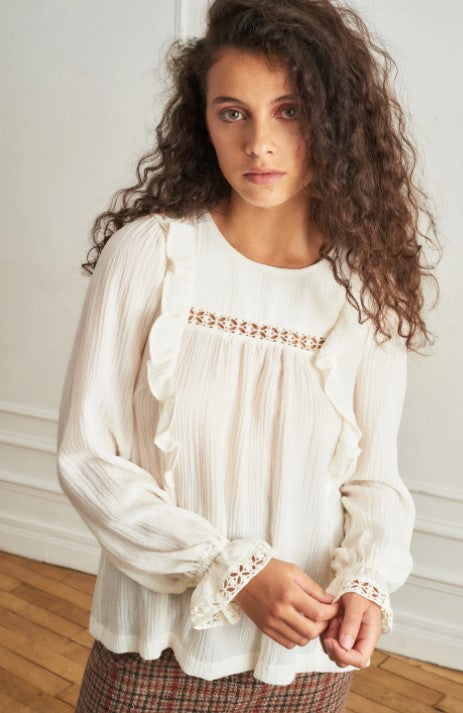 Pleated flowy blouse with ruffle detail. button back. elastic cuffs