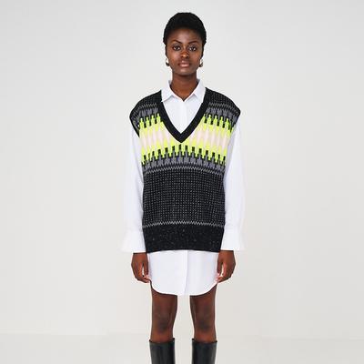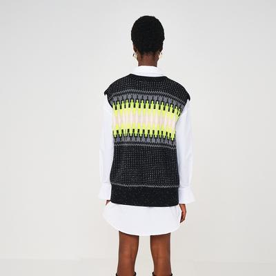 Black, grey, neon yellow, tan, and white fairisle cashmere sweater vest