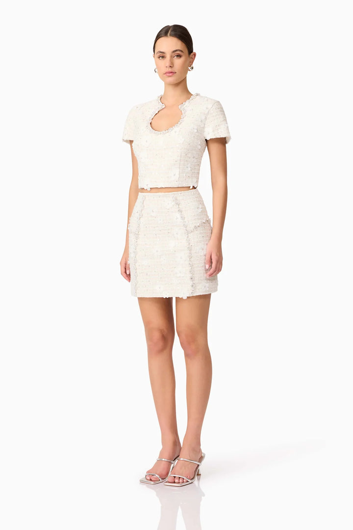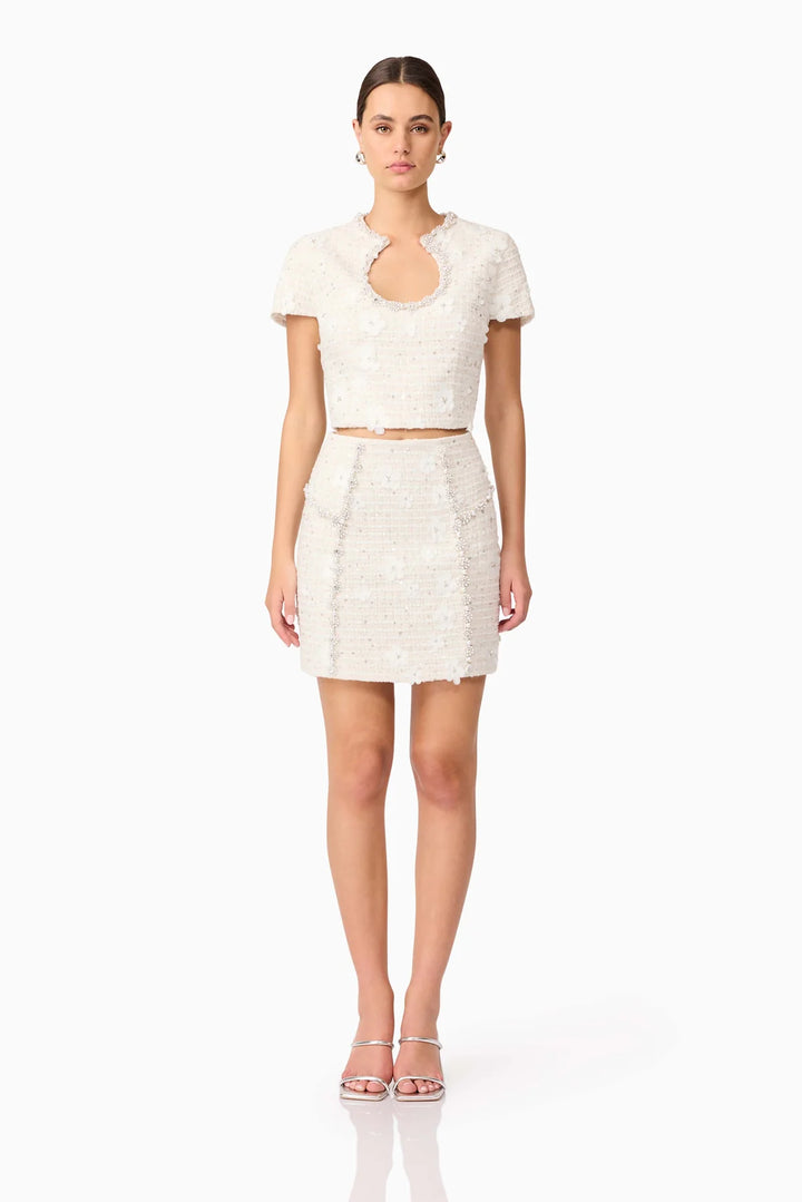 Chic and feminine, the Ellouise Embellished Tweed Set in White is a modern take on classic elegance. Featuring a structured top and matching mini skirt, this coordinated look is crafted from textured beaded tweed fabrication and finished with refined pearl accents for a timeless appeal.