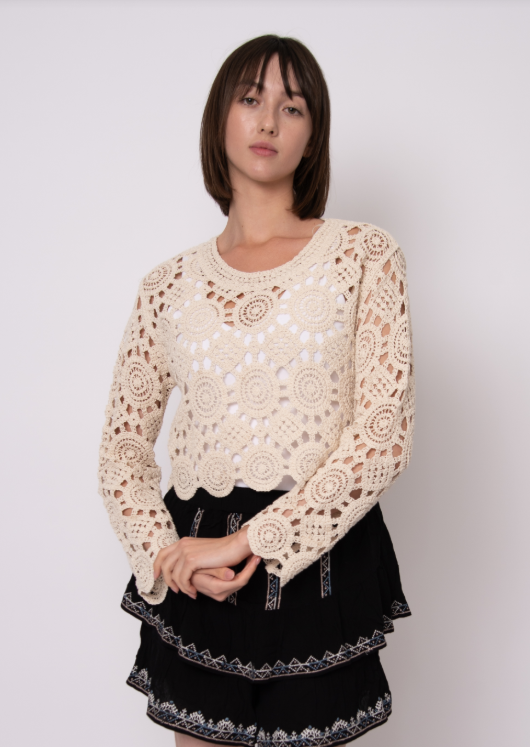 The Eris Top is a beautifully crafted crochet pullover in a soft parchment hue. This long sleeve crew neck design offers timeless elegance with its intricate crochet detailing. Perfect for layering or wearing solo, the relaxed fit provides comfort while the neutral parchment tone pairs effortlessly with any wardrobe. Ideal for adding texture and warmth to your everyday style.