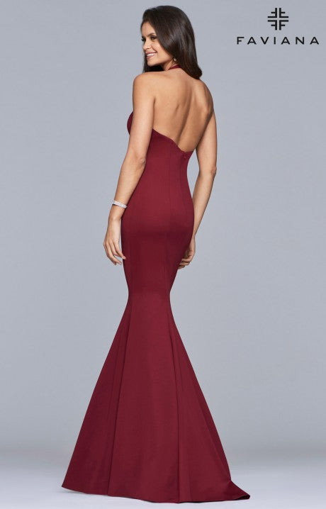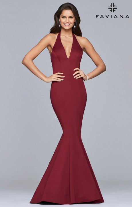 Get ready to feel your best stepping out in this oh-so-flattering luxe jersey gown! Featuring a halter style plunging V-neck that goes around to an open back, this mermaid gown is ready to wow.