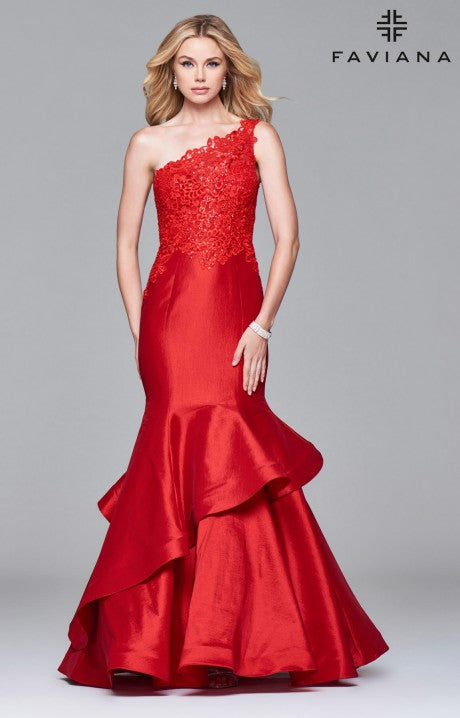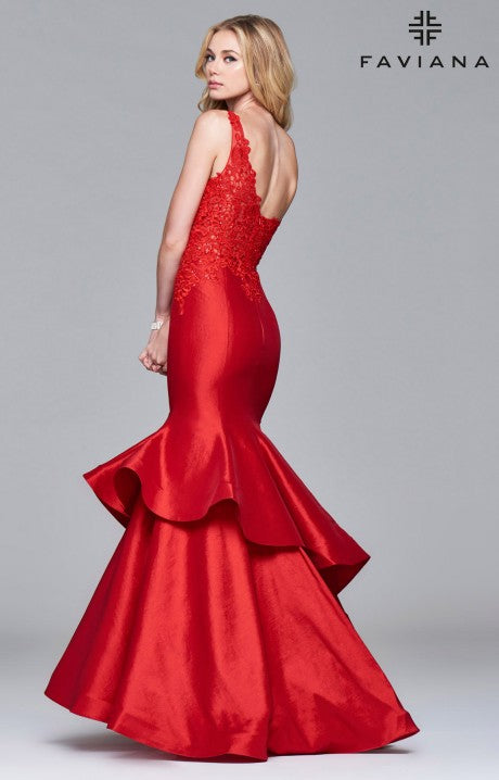 A gorgeous one shoulder mermaid gown that has elegant ruffles at the bottom. The top is a lace material with a low back. The bottom half is a satin material.