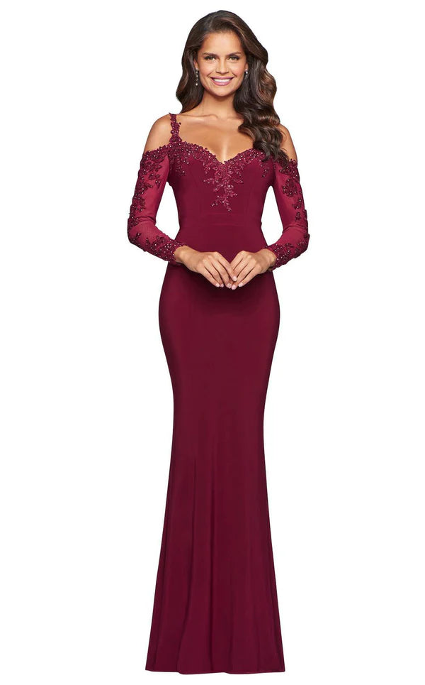 This strappy style features cutaway shoulders and a portrait neckline. Sparkling embroidery and illusion effects make up the long sleeve bodice with a festive effect. Posh fabric is fitted over your hips to reveal a light flare with shirring.