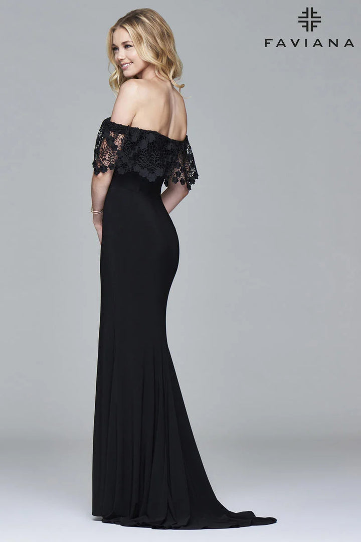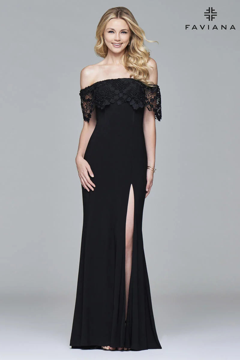 The dress features an off-the-shoulder, flowy lace overlay and a fit and flare skirt, which looks great on every body type.