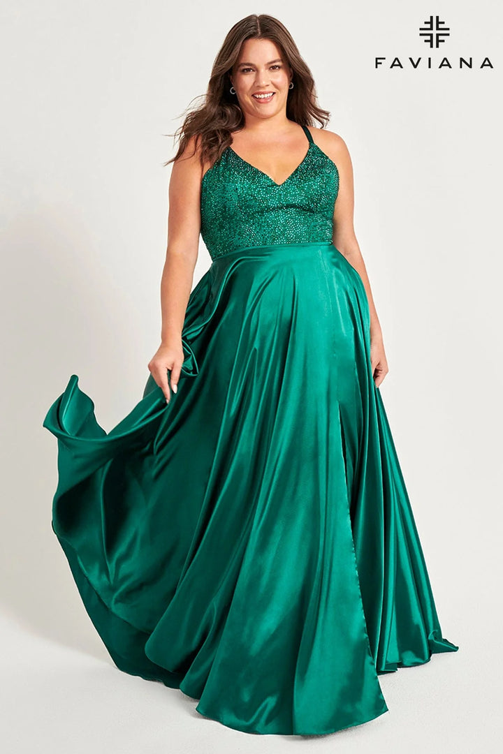 It's giving colors, sparkles, and silhouette! Faviana Style 9524 is the hottest curve style of the season. With a rhinestone embellished bodice and a flowy a-line skirt featuring a slit, this style is perfect for those who want a trendy take on a classic silhouette.