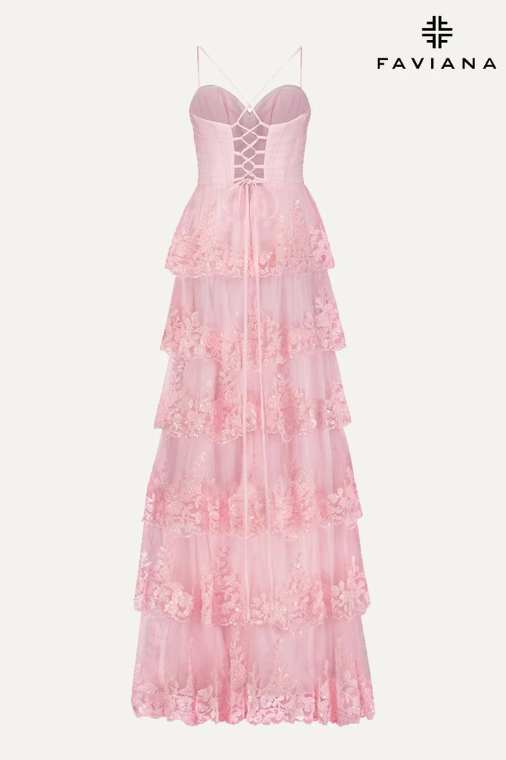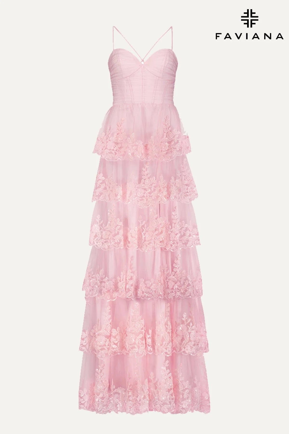 Faviana style E11058 Tulle Gown With Tiered Skirt And Beaded Embellishments