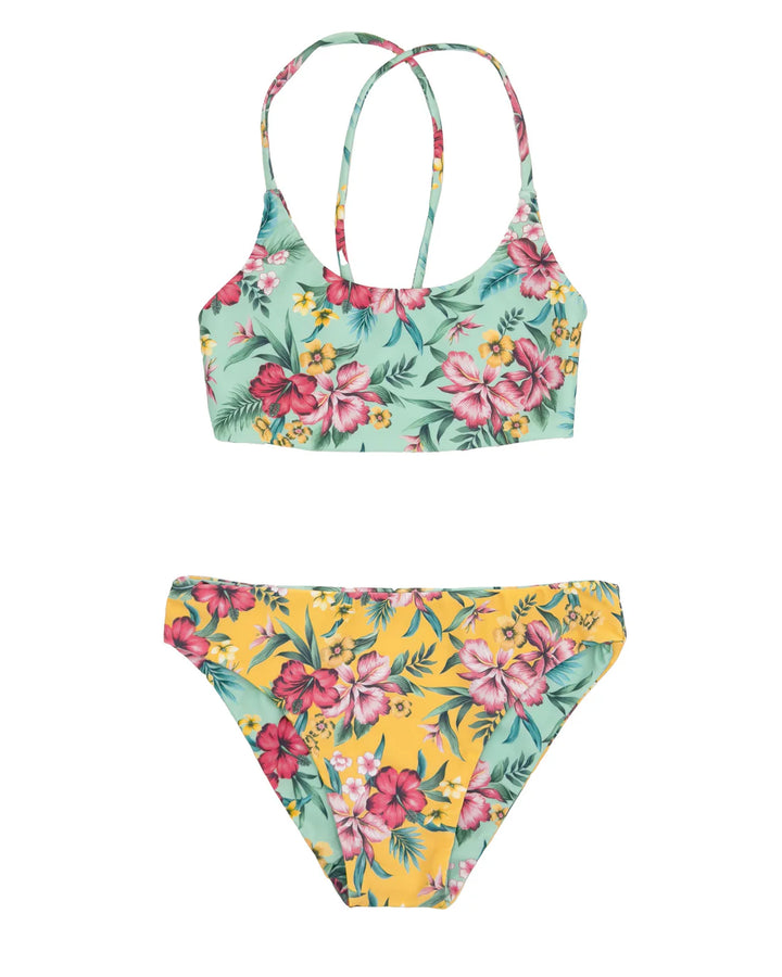 One of Feather 4 Arrow's best-selling reversible bikinis that can be worn multiple ways, paradise cove print reverses to beach glass and golden sun, double lined for extra support and coverage.