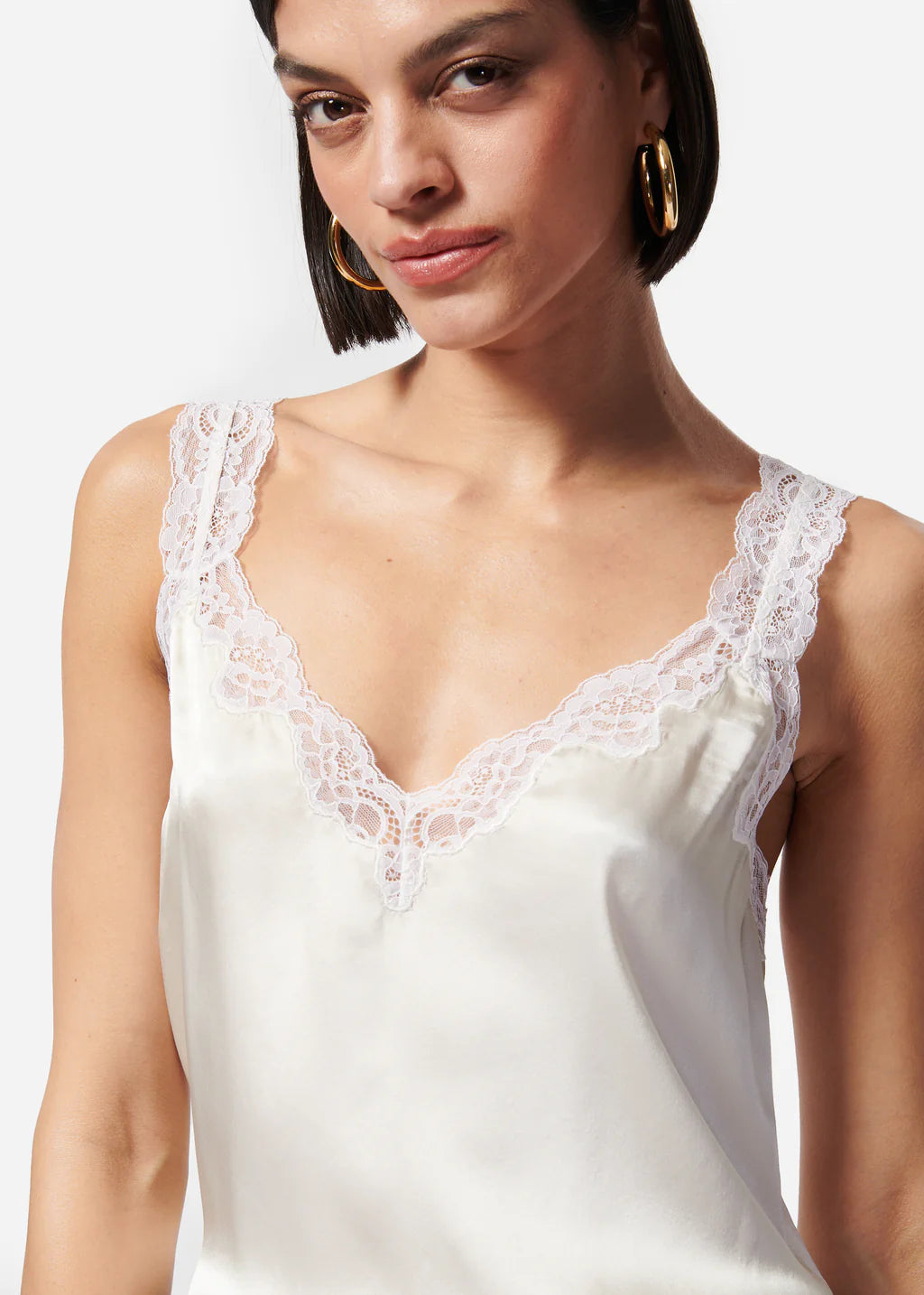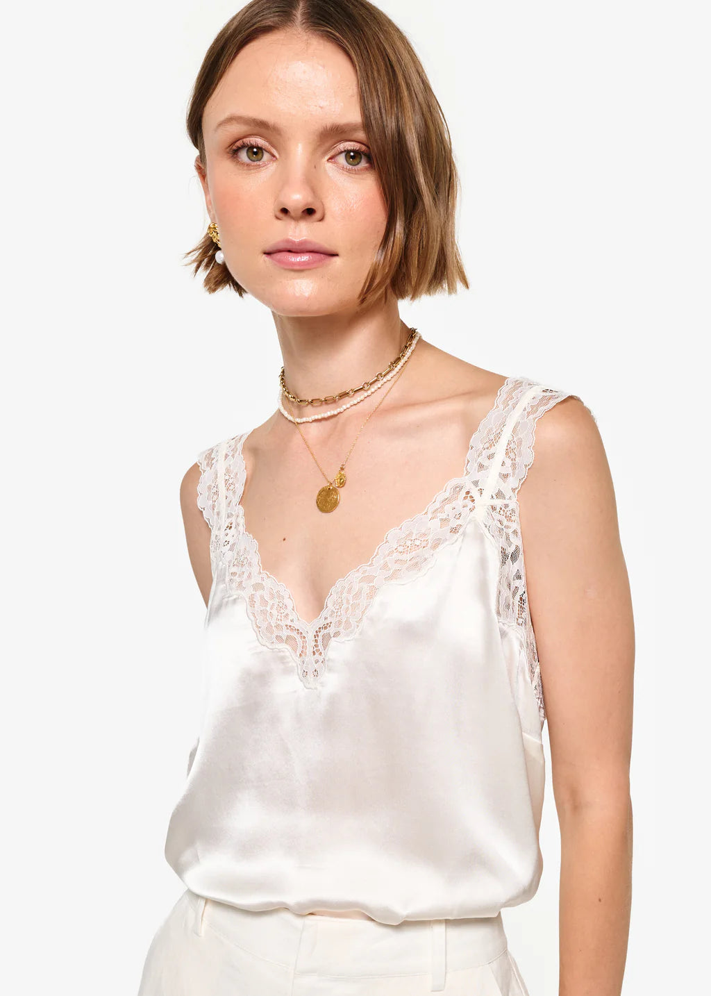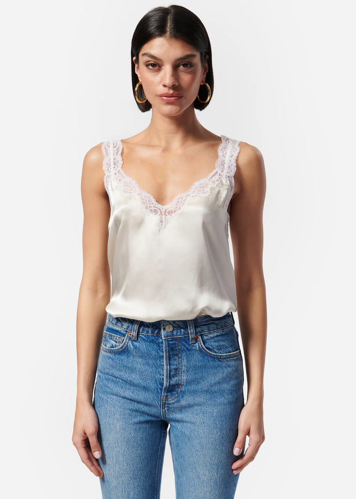 The Fernanda Cami from Cami NYC features a v-neckline and sheer embroidery edge lace, which continues up the straps.