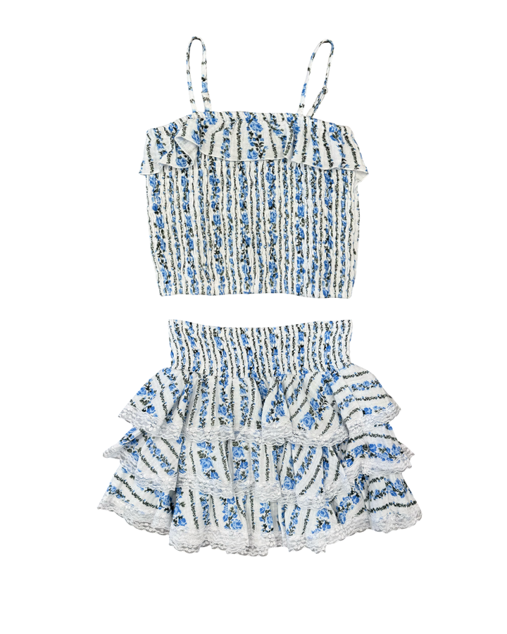 Introduce your daughter to timeless elegance with this charming floral ruffle skirt from Flowers by Zoe. Featuring a delicate white and blue palette, intricate lace trim, and a graceful ruffled silhouette, this piece captures a demure, sophisticated aesthetic perfect for special occasions or everyday sophistication. The soft floral design and quality construction make it a versatile wardrobe essential that she'll love wearing. Ideal for creating picture-perfect moments with effortless style and grace.