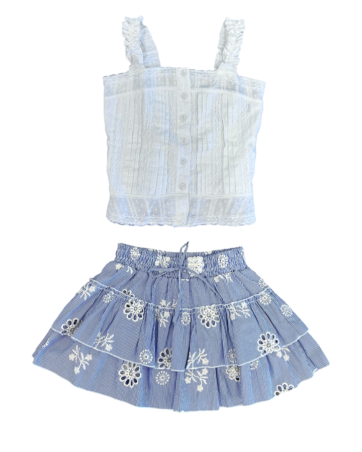 Elevate her wardrobe with this charming floral eyelet ruffle skirt from Flowers by Zoe. Crafted from soft, breathable cotton, this piece features delicate blue stripes paired with intricate floral eyelet detailing that adds timeless elegance. The playful ruffle skirt design brings movement and personality to any outfit, making it perfect for special occasions or everyday wear. A versatile essential that combines comfort with sophisticated style, this skirt is sure to become a favorite in her closet.