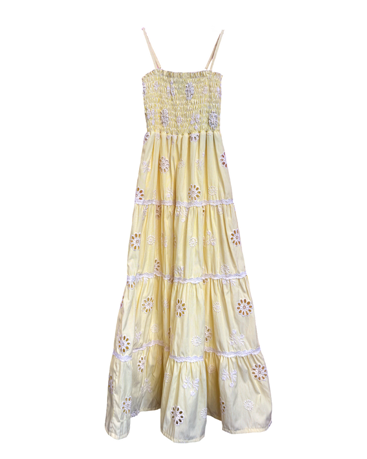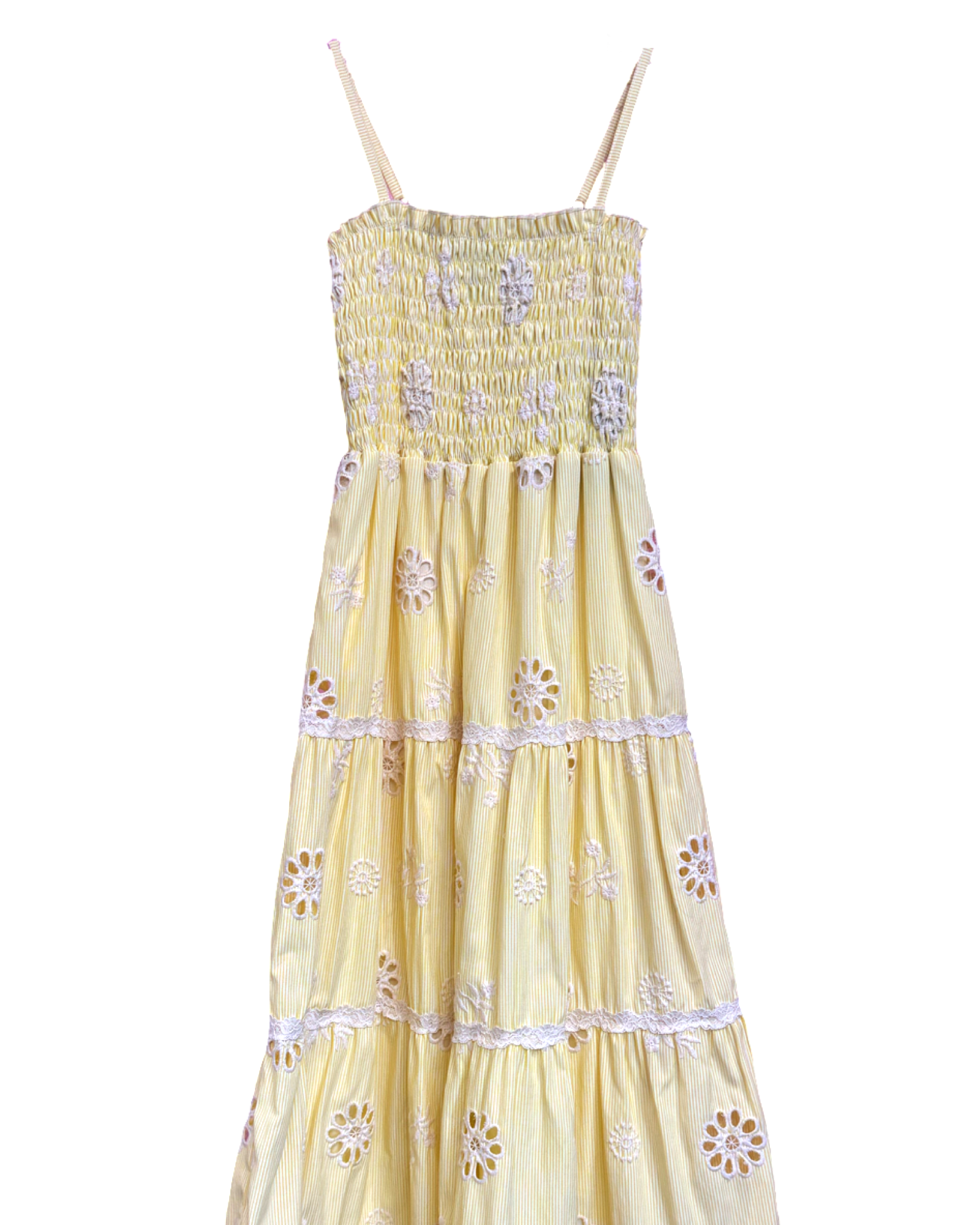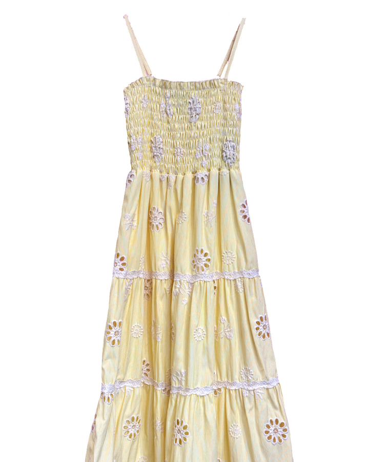 Effortless elegance meets playful style in this charming mini stripe eyelet maxi dress from Flowers by Zoe. Perfect for girls who love versatile pieces, the soft yellow palette and delicate eyelet detailing create a fresh, summery look that transitions seamlessly from beach days to dinner outings. The flowing maxi silhouette offers comfort and sophistication, making it an ideal resort-wear essential that works as hard as your vacation does. Whether she's splashing in the waves or enjoying sunset dining, this sundress delivers timeless appeal with modern flair.