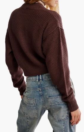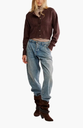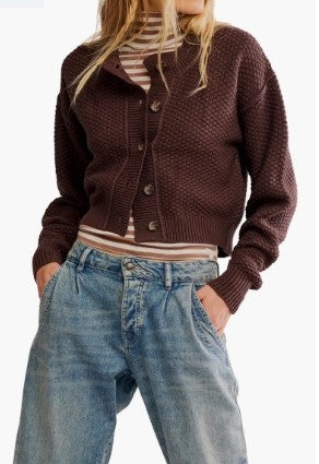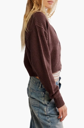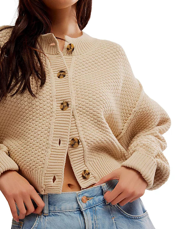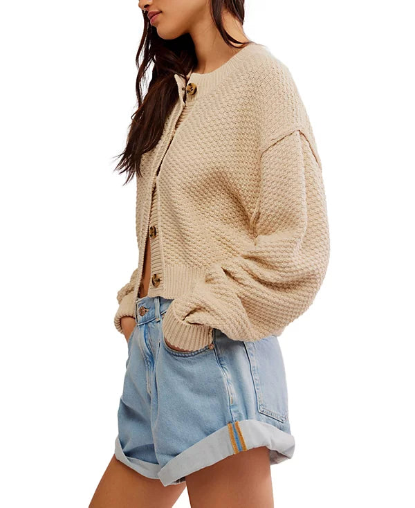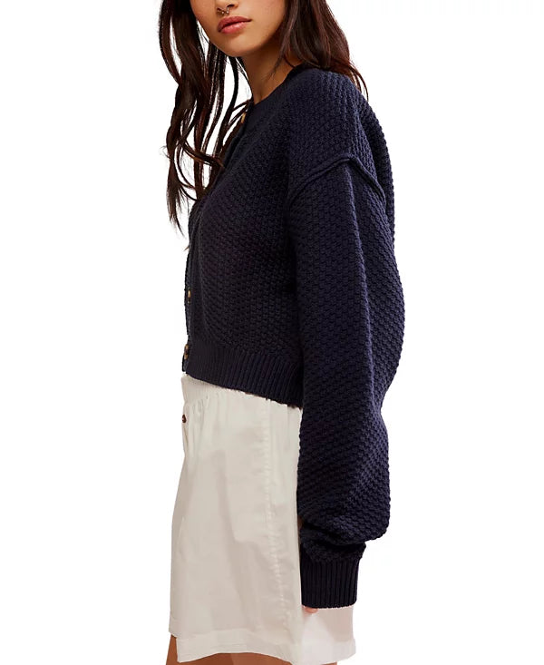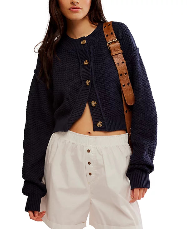 This season-perfect cardi is knit in a cropped silhouette with dropped shoulders and soft texture.