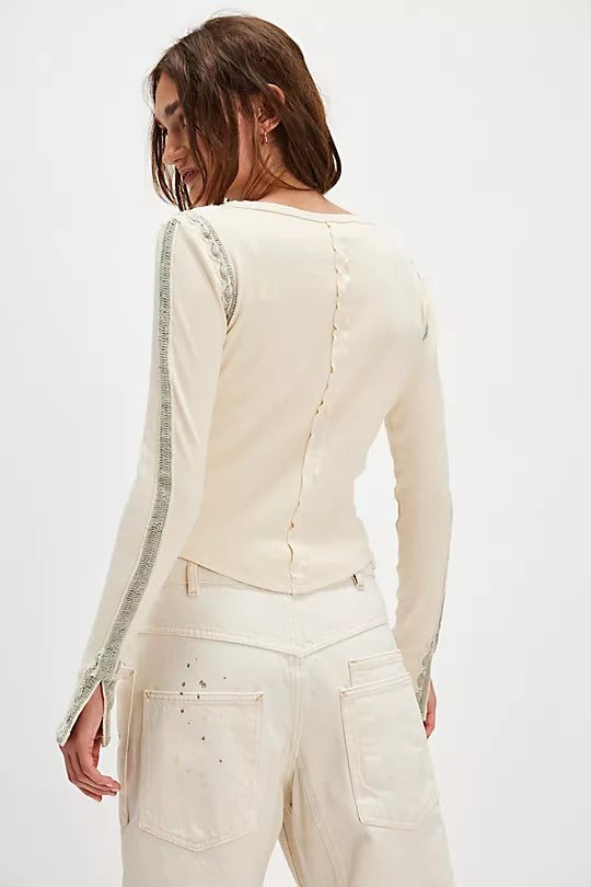Features: Ribbed cotton fabrication, boat-neckline, long-sleeves with split hems, contrast lace trim
