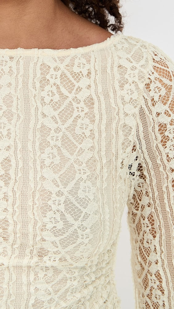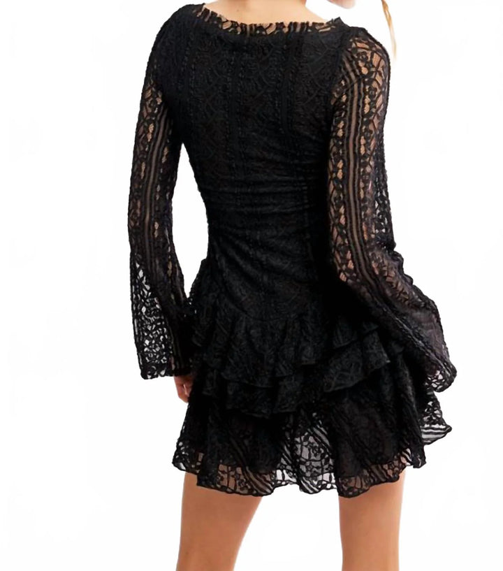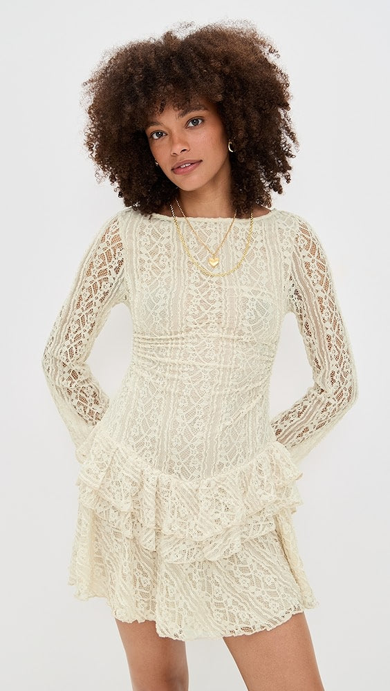 Floaty layered ruffles add fluttering movement to this leggy-length dress framed by semisheer sleeves and romanced by intricate lace.