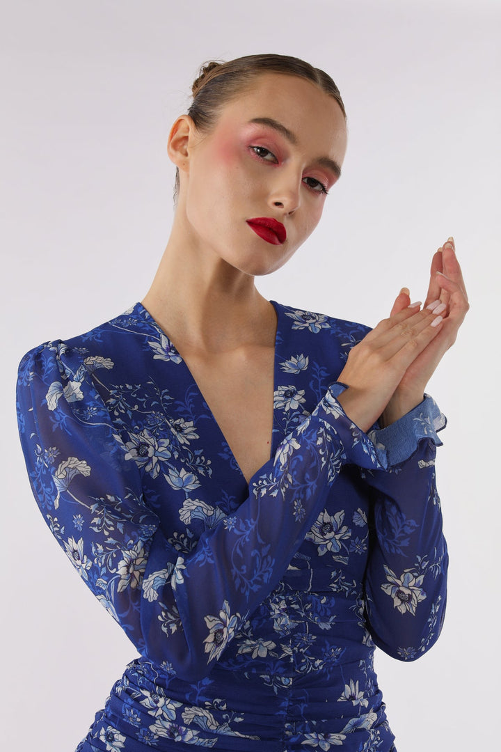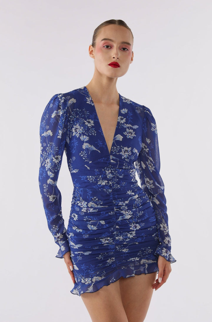 Gia is a chic mini dress in our original porcelain print inspired by blue china. Featuring a deep V-neck, long puffed sleeves with ruffle cuffs, and an open back. The mini skirt is fitted, ruched throughout and features a ruffle trim at the hem.