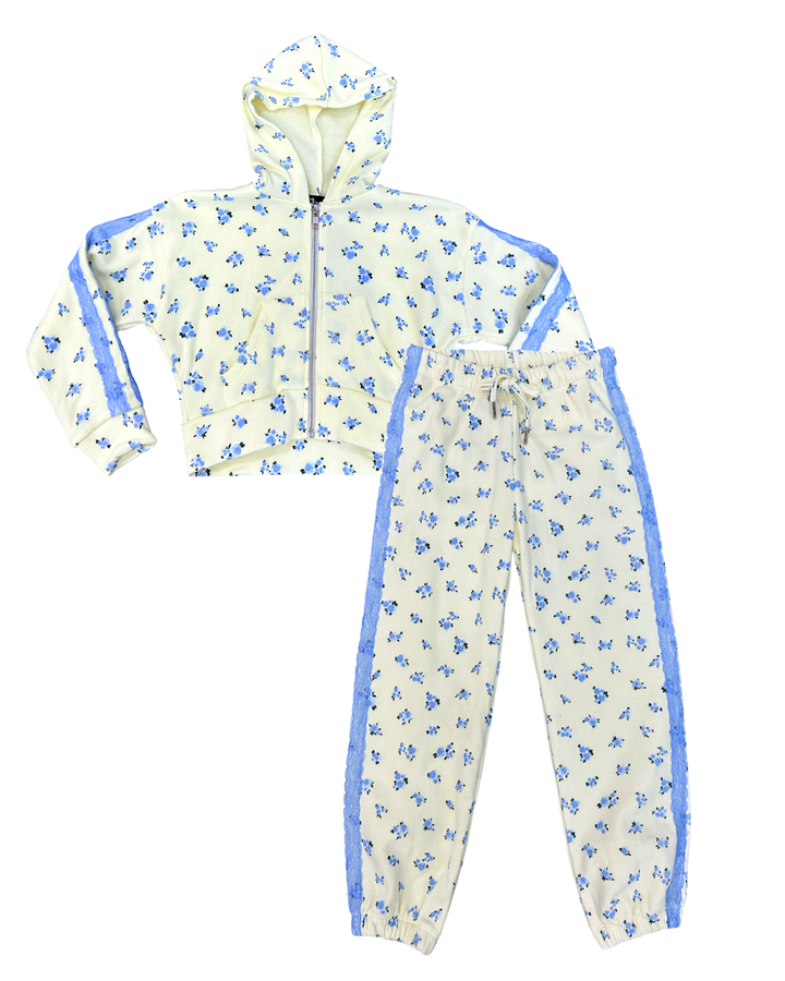 These cozy sweatpants bring comfort and style together in one adorable package! Featuring a cheerful yellow base with a charming blue floral design, they're perfect for lounging or everyday wear. Delicate lace stripes run down the sides, adding a sweet touch of detail that makes these pants stand out. Soft, stretchy fabric keeps her comfortable all day long, whether she's playing, relaxing, or heading out. A fun choice for any girl who loves a pop of color and playful style!